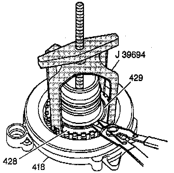 1. Use the J 39694 second clutch spring compressor to compress the spring and remove the snap ring (429). Then remove the spring compressor.