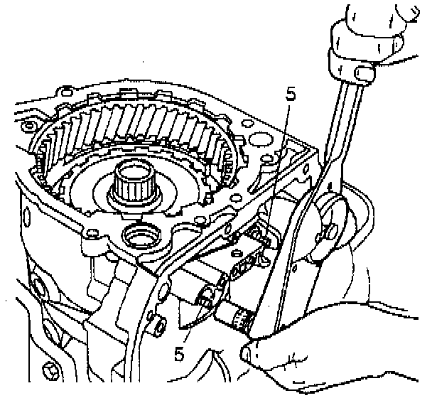 2. Install the forward clutch support studs (5). First tighten the stud near the bench at the rear of the vehicle. Then tighten the stud on the vehicle front side.