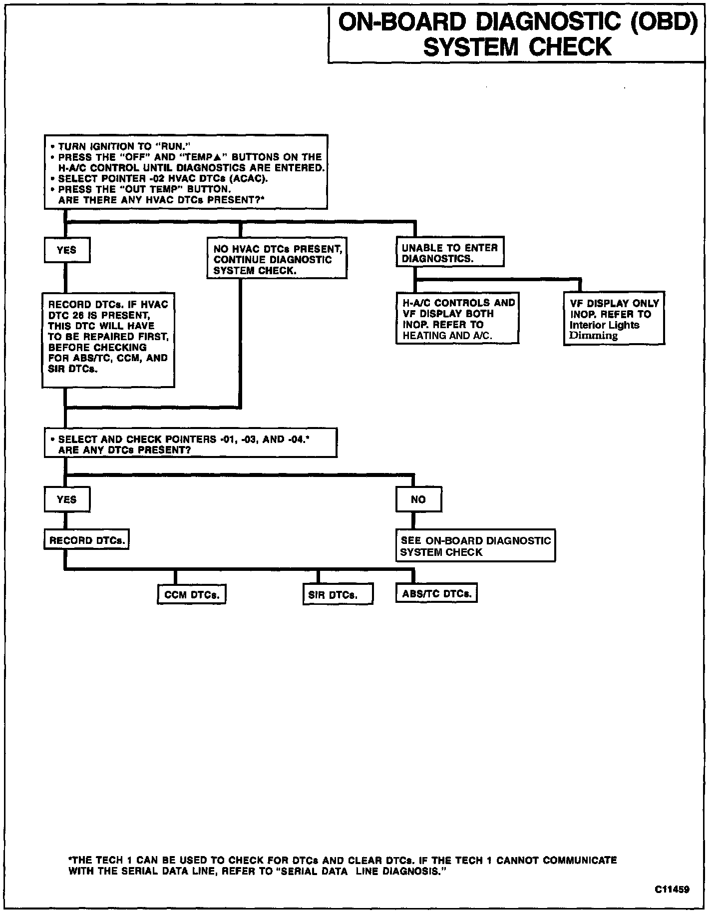 1. If diagnostic system is not functional, a problem might be present in the ACAC or related system. (This could mean that the diagnostic system has detected a problem in the data line that connects all of the computer systems together. This will also stop all Tech 1 communication. Refer to DATA LINK CONNECTOR. Data Link Connector