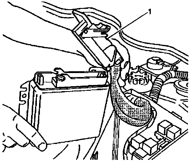 3. Flip the release lever and disconnect the harness connector (1) from the ECM.