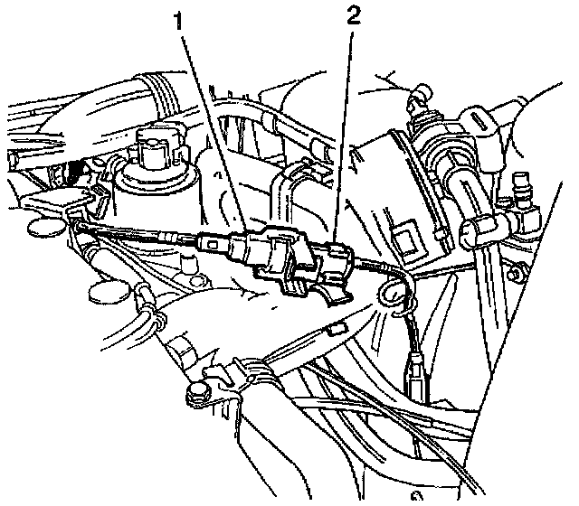 3. Install the cruise control cable to the heater hose clip (2).