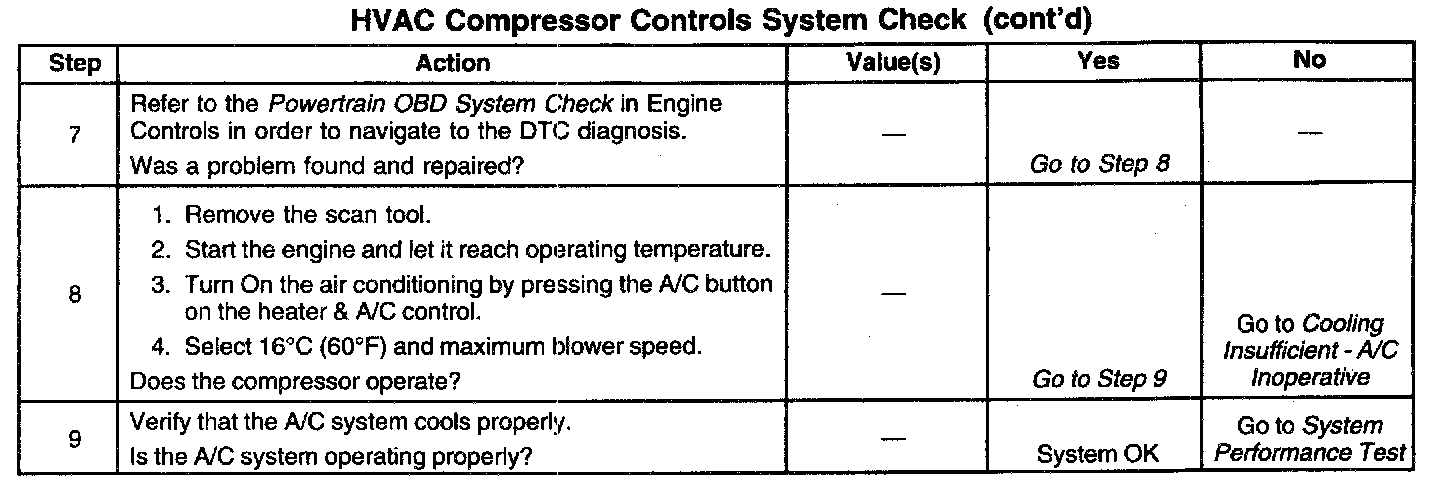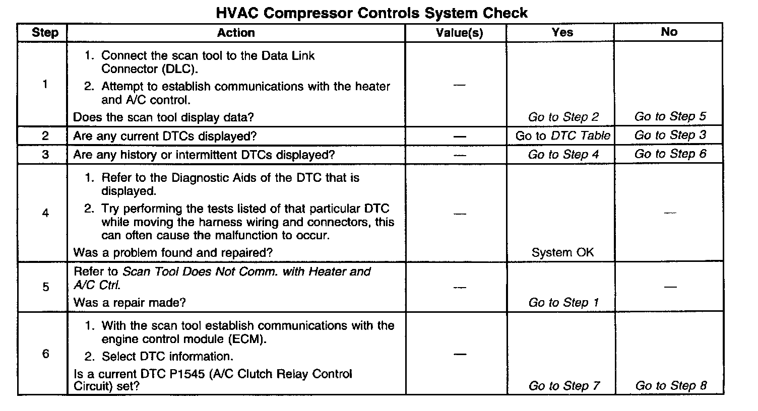 The Compressor Controls System Check is an organized approach to identify problems associated with the heater & A/C control. This check must be the starting point for any compressor controls complaint, and will direct you to the next logical step in diagnosing the complaint. The heater and A/C control is a very reliable component and is not likely the cause of the malfunction. Most system complaints are linked to faulty wiring and connectors, and occasionally to components. Understanding the computer system and using the tables correctly will reduce diagnostic time and prevent unnecessary parts replacement.