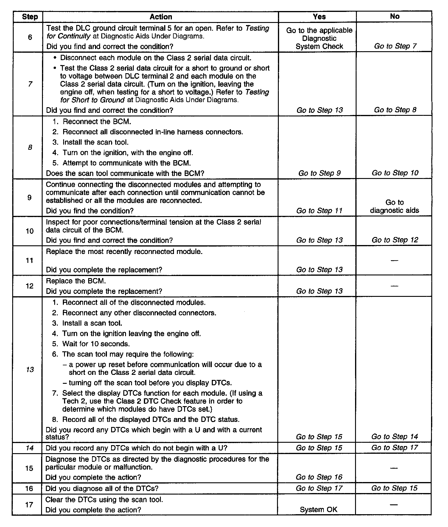 7. The Class 2 serial data circuit is shorted to voltage or ground. The condition may be due to the wiring or due to a malfunction in one of the modules. When testing the wiring for a short, make sure there is not a module connected to the wire being tested.