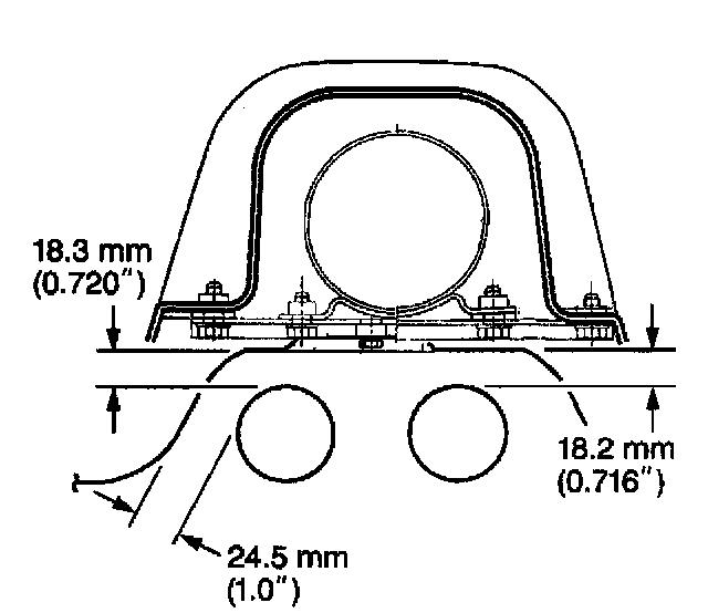 Catalytic converter clearances are measured at the points and with the tolerances shown.
