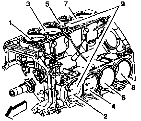5. During and after installation, check to make sure each piston is positioned properly in the correct cylinder. The locating arrow on the the top each piston must be pointing toward the front of the engine.