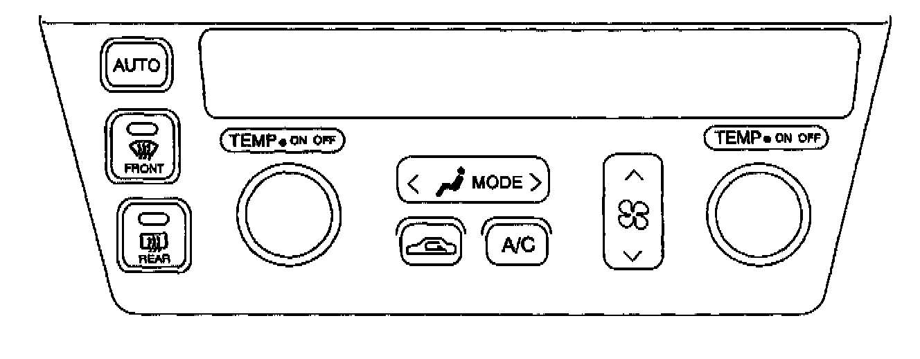 The heater and A/C control includes buttons to select operating modes, a fan speed increase/decrease switch, the rear defog control button, and a vacuum fluorescent display panel. When the parklamps or headlamps are turned on, the buttons are illuminated. The temperature for the driver and passenger is controlled individually by two separate knobs.