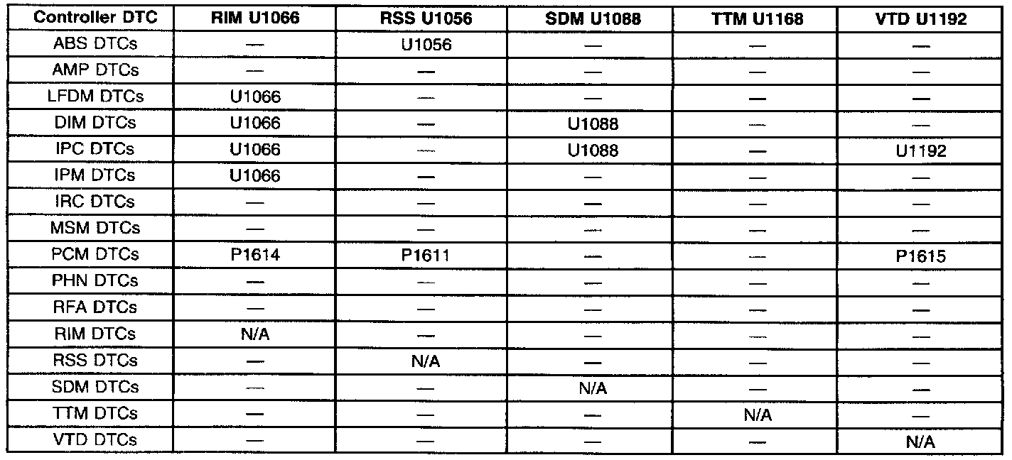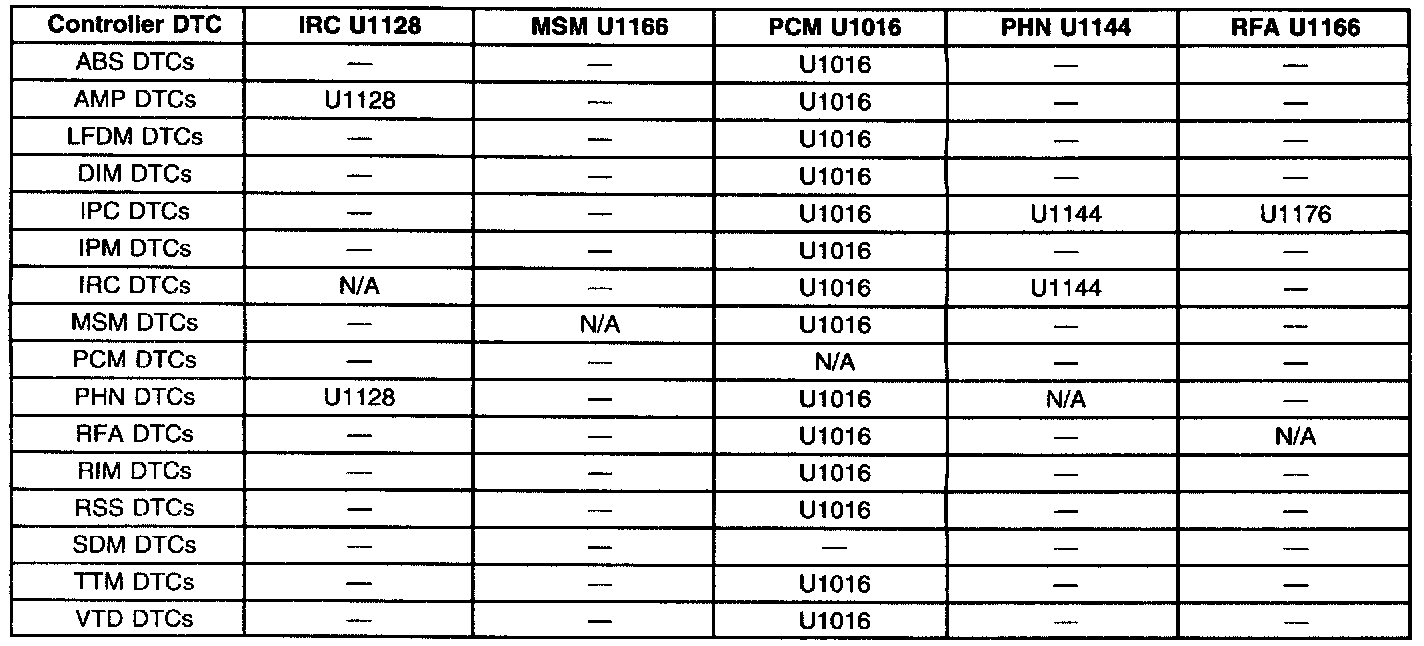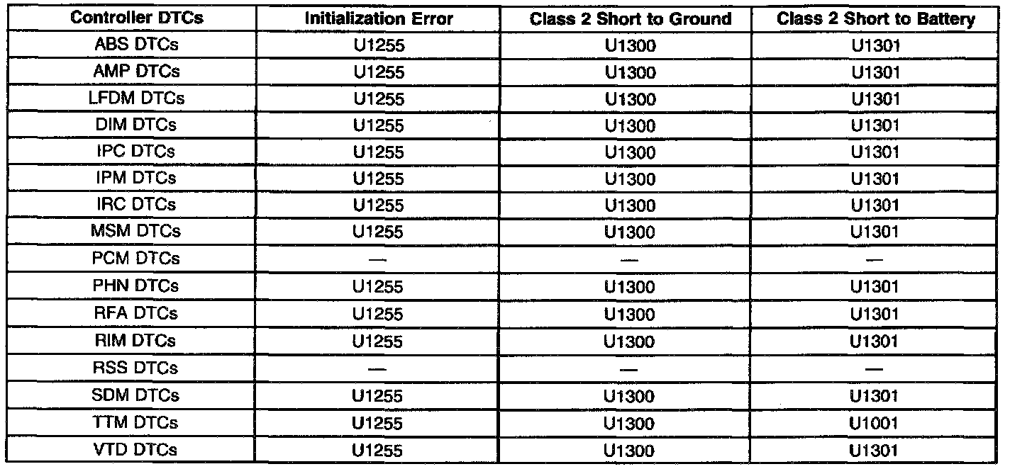 ^ The left column of each chart indicates which module observed this Loss of Class 2 Serial Data, and internally set a DTC to identify this condition.