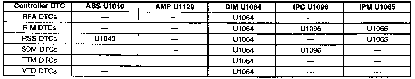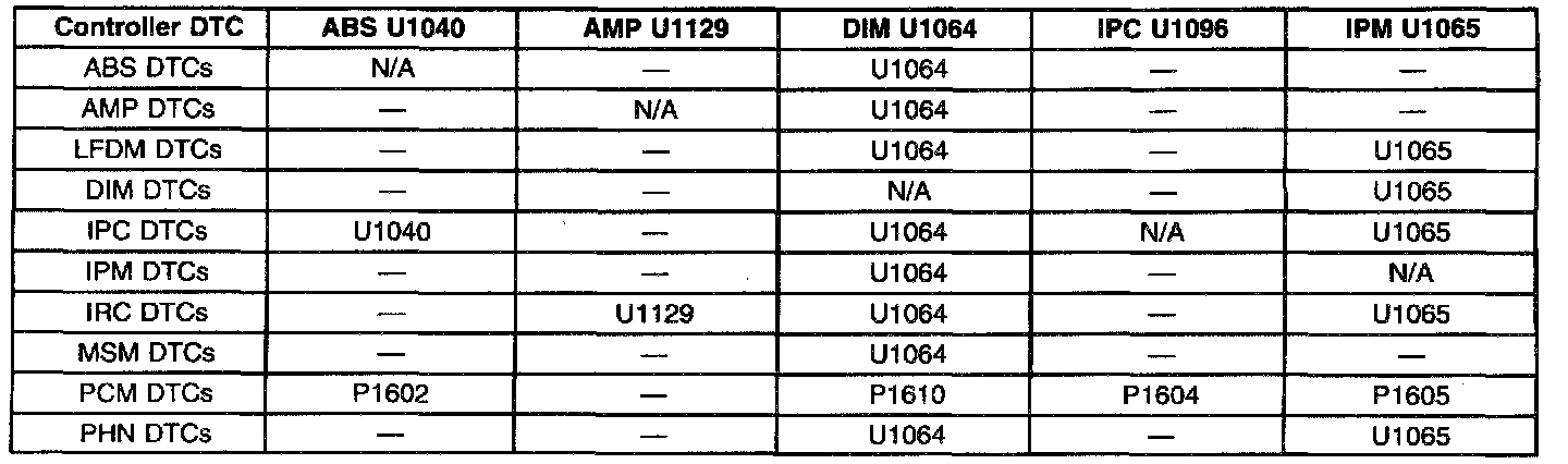 LOSS OF CLASS 2 SERIAL DATA DTCS MATRIX