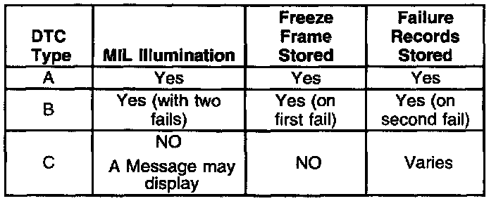 DTCs are categorized by type. The type will indicate the action the DTC will take in storing a failure and illuminating the MIL. The following table indicates what action each DTC type will take when a failure is recorded. Type C DTCs that DO NOT display a message were formerly referred to as Type D.In order for a type B DTC to request MIL illumination the DTC must fail in two consecutive drive trips in which the DTC tests.