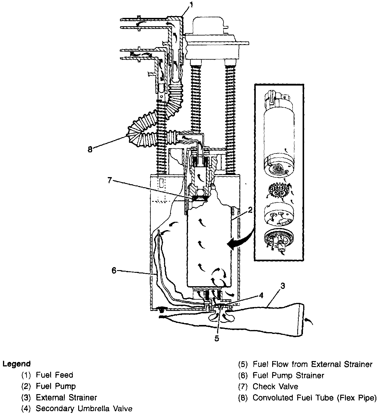 The modular fuel sender assembly mounts to the threaded opening of the plastic fuel tank with a multi-lipped seal and threaded retainer (nut). The spring loaded reservoir, containing the exterior inlet strainer, electric fuel pump and pump strainer, maintains contact with the tank bottom. This design provides: