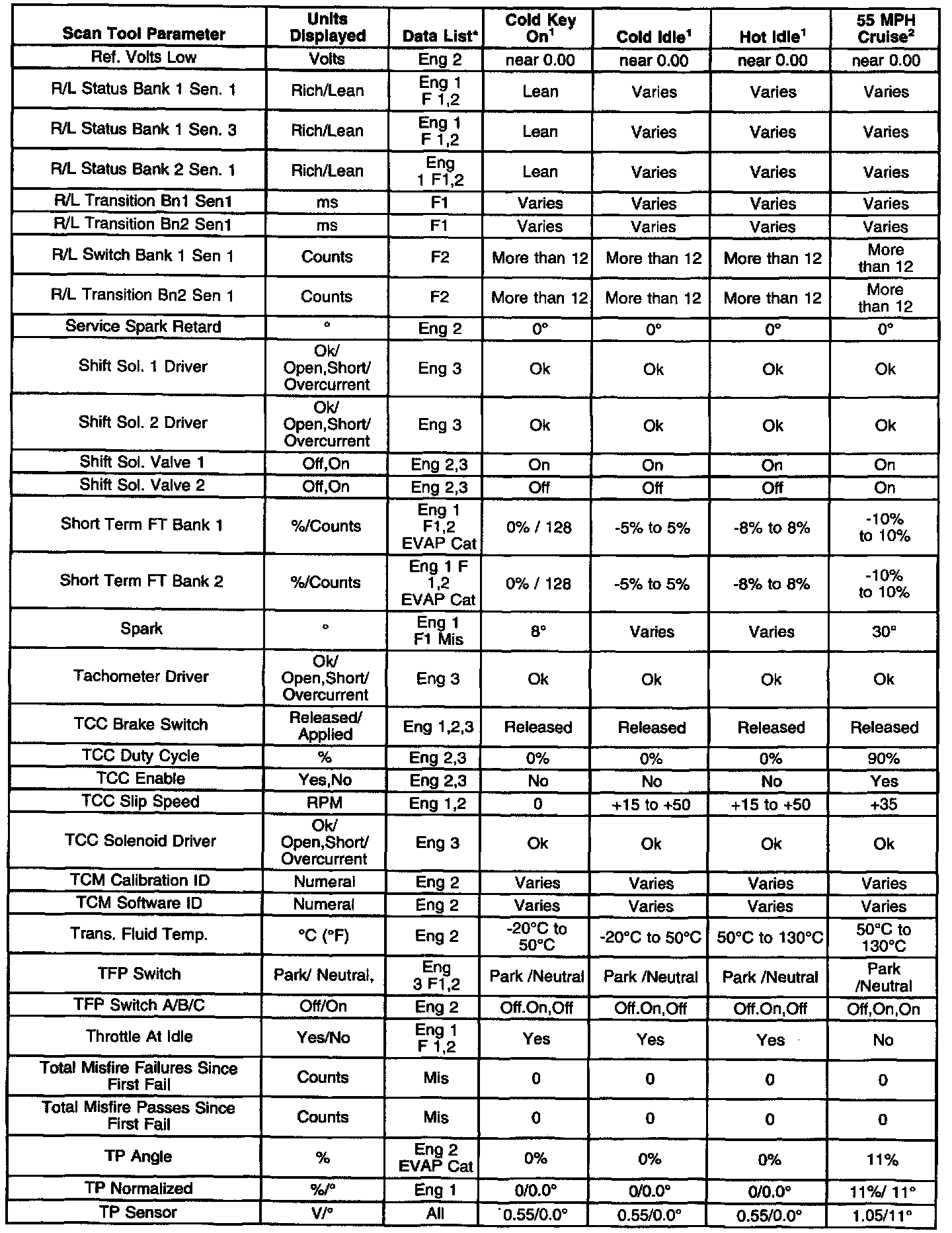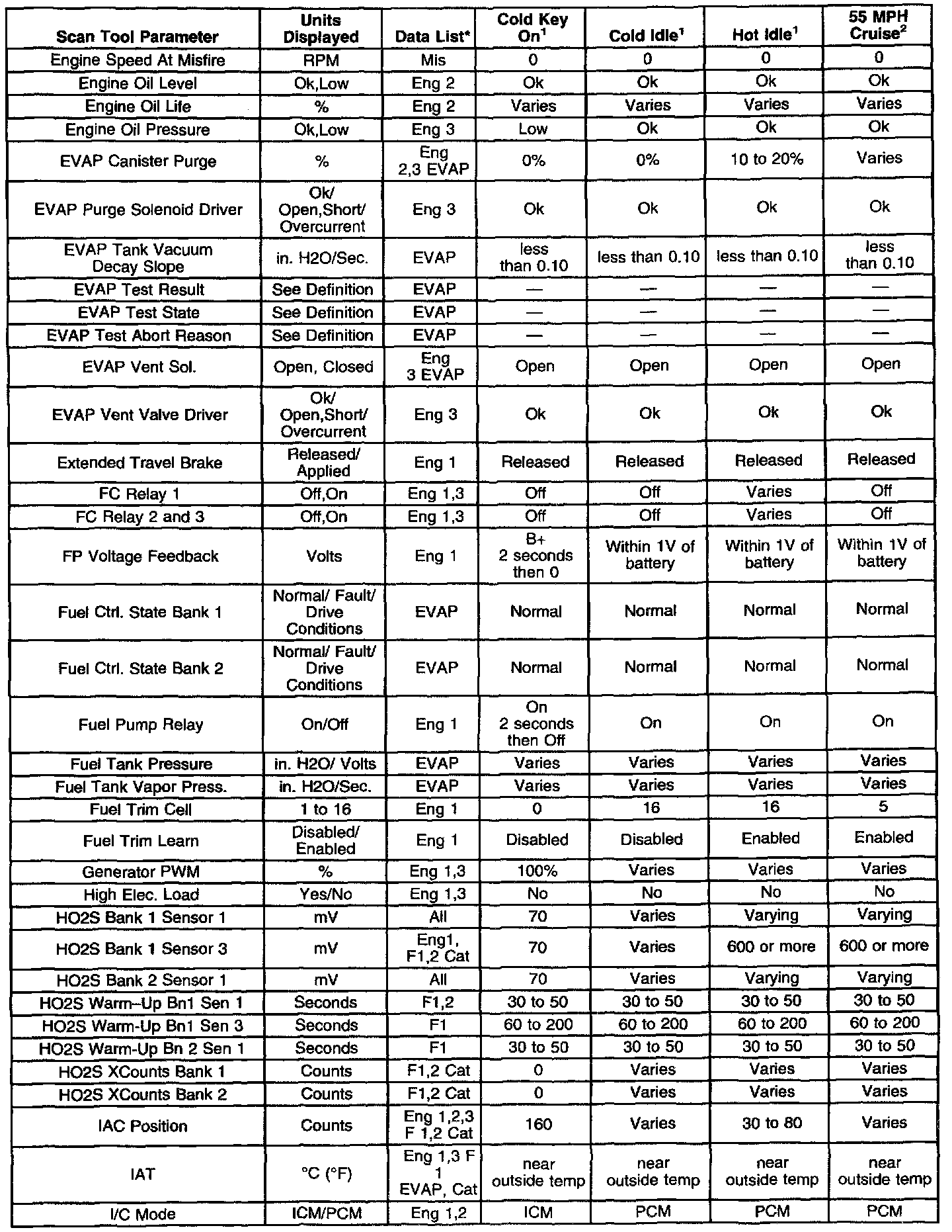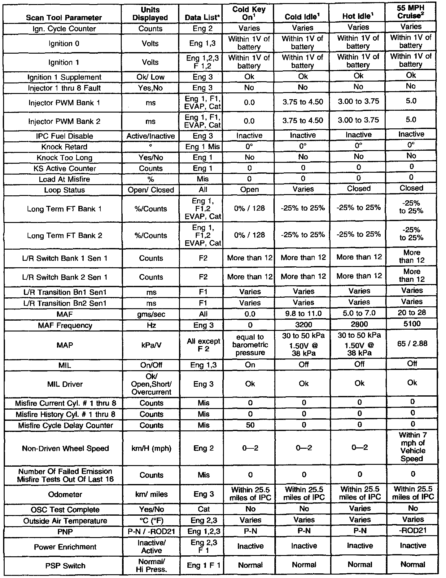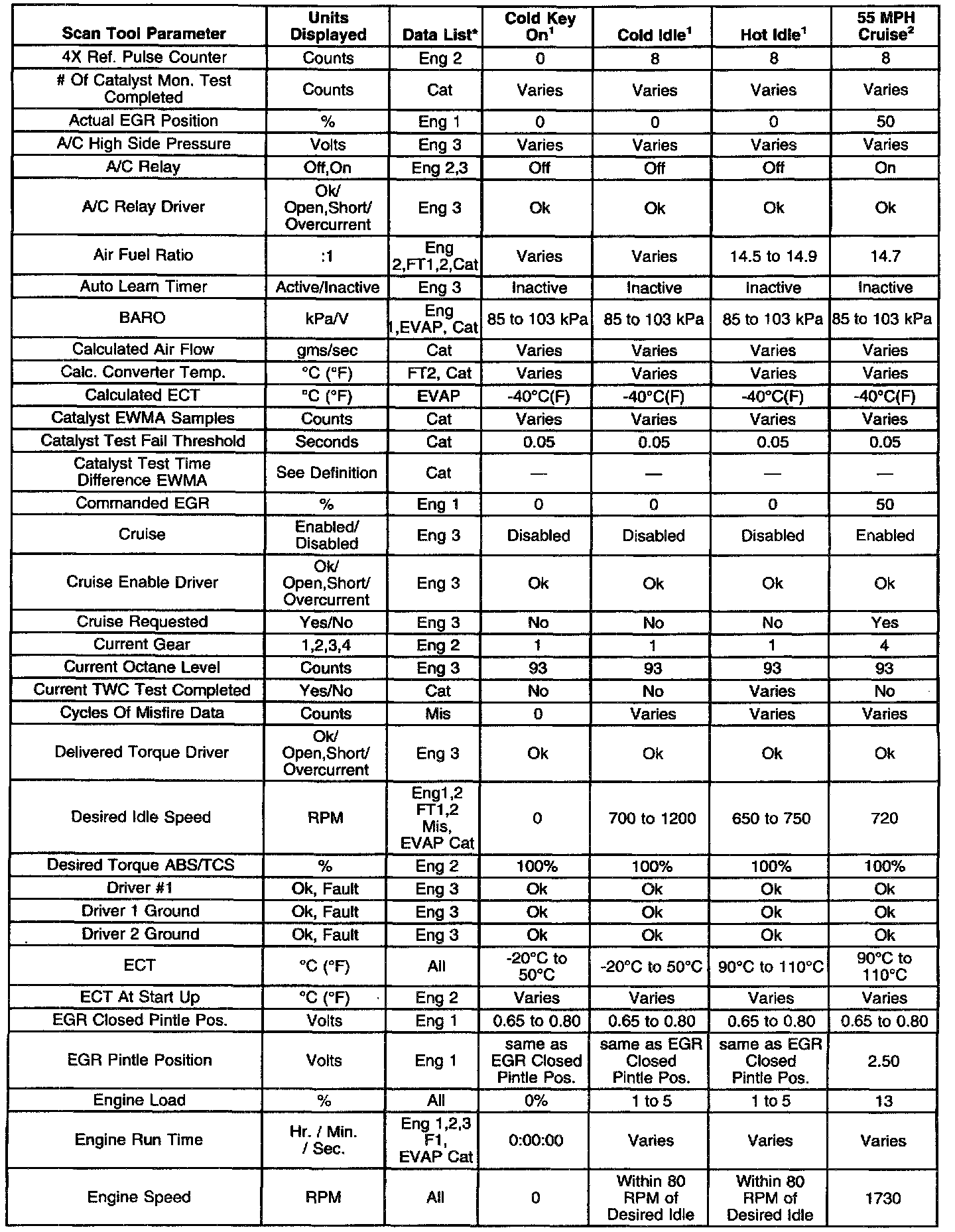 ^ On-board diagnostics are functioning properly. Scan tool values from a properly running engine may be used for comparison with the engine you are diagnosing. The Engine Scan Tool Data List represents values that would be seen on a normally running engine.