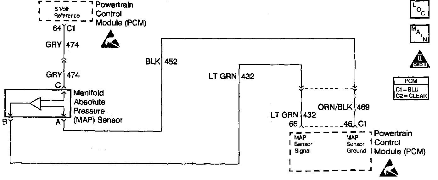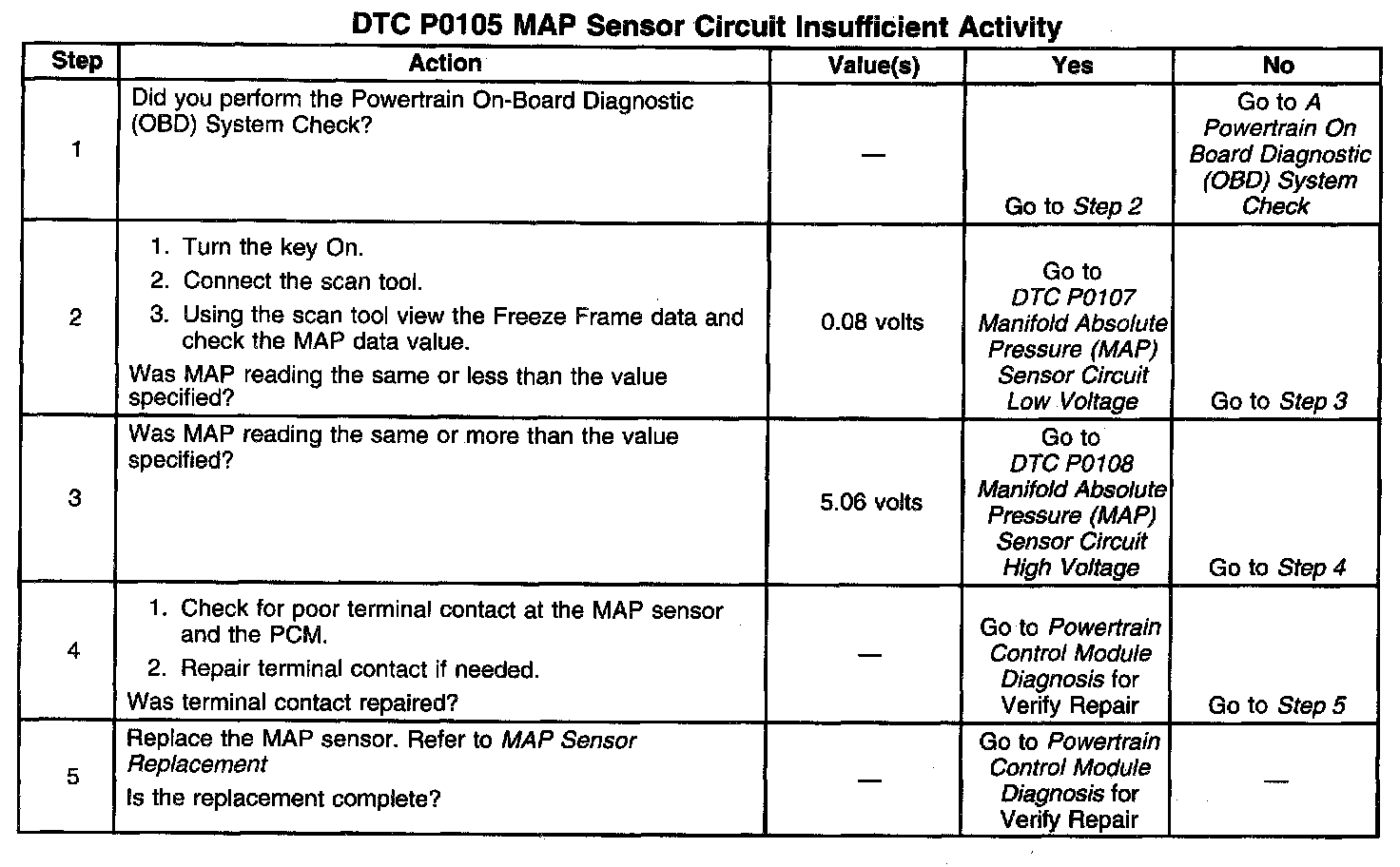 This diagnostic test is designed to determine when the MAP sensor is sticking. The PCM does this by checking for throttle position changes that are not immediately followed by MAP signal changes. When a throttle position change of 3.2 degrees in 0.5 second occurs, the PCM watches the MAP signal for one second following the throttle position change. If the MAP signal does not change by at least 4 kPa in this period and the MAP sensor reading is more than 17.3 kPa different than the expected MAP reading, based on engine speed and throttle position. If this condition is repeated 5 time then DTC P0105 will set.
