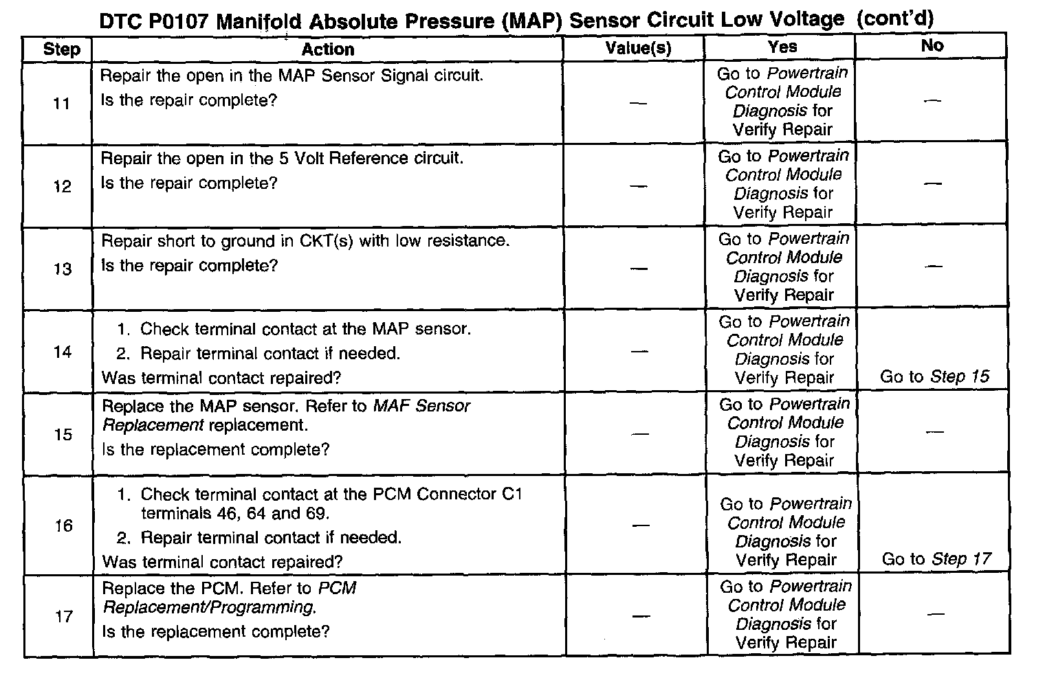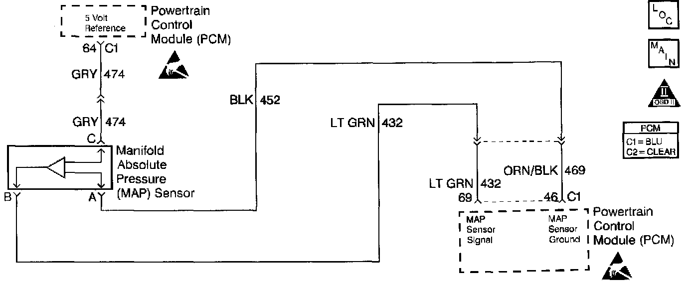 The Manifold Absolute Pressure sensor is a sensor that changes resistance based upon manifold vacuum. The PCM provides a 5 volt reference and ground. The MAP sensor signal varies between ground and 5 volts as manifold vacuum varies. As MAP decreases, voltage decreases (low engine load, high vacuum). As MAP increases, voltage increases (high engine load, low vacuum). The PCM uses the MAP sensor values as an indicator of engine load. A short to ground or open condition would cause the MAP sensor signal to go low, setting DTC P0107.