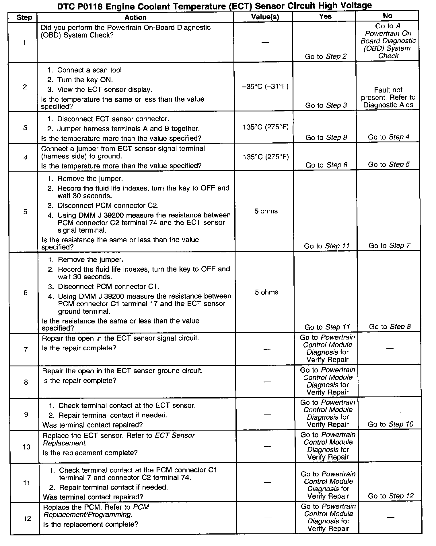 The Engine Coolant Temperature sensor is a thermistor, a sensor whose resistance varies with temperature. The ECT sensor signal is on CKT 410 and sensor ground on CKT 808, As the temperature increases, sensor resistance decreases. Low coolant temperature will result in high signal voltage on CKT 410. DTC P0118 sets because the coolant temperature cannot be less than -38°C (-36°F) when IAT is greater than -5°C (23°F) or the engine has been running long enough too warm above -38°C (-36°F).