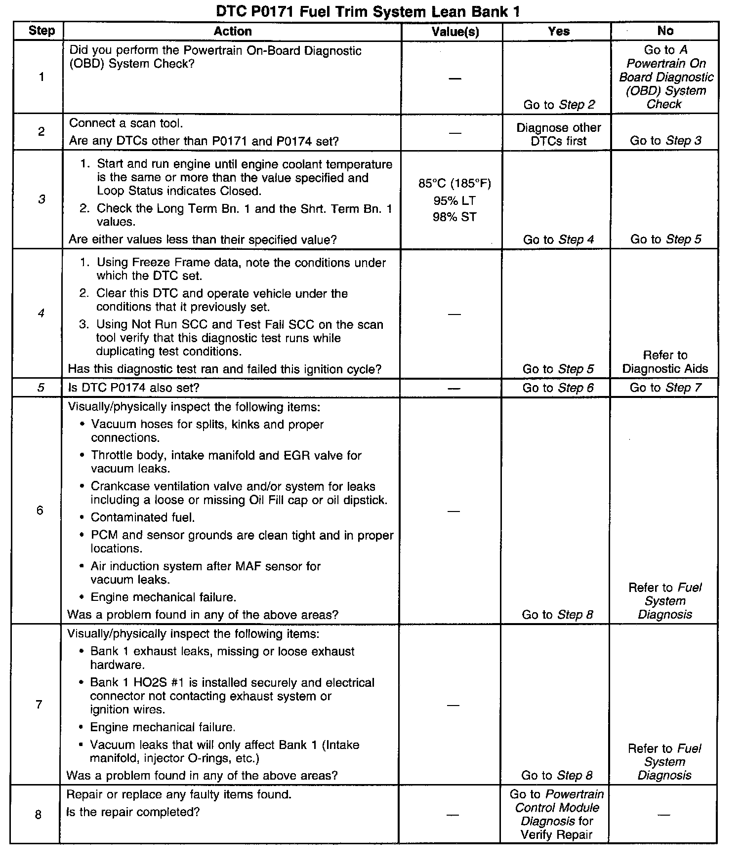 Ideal fuel trim values are around 0%; if heated oxygen sensor signal is indicating a lean condition, the PCM will add fuel, resulting in a fuel trim above 0%, 100% is maximum lean. If a rich condition is detected, the fuel trim values will be below 0%, -99% is maximum rich, indicating that the PCM is reducing the amount of fuel delivered. If an excessively lean condition is detected, the PCM will set DTC P0171.
