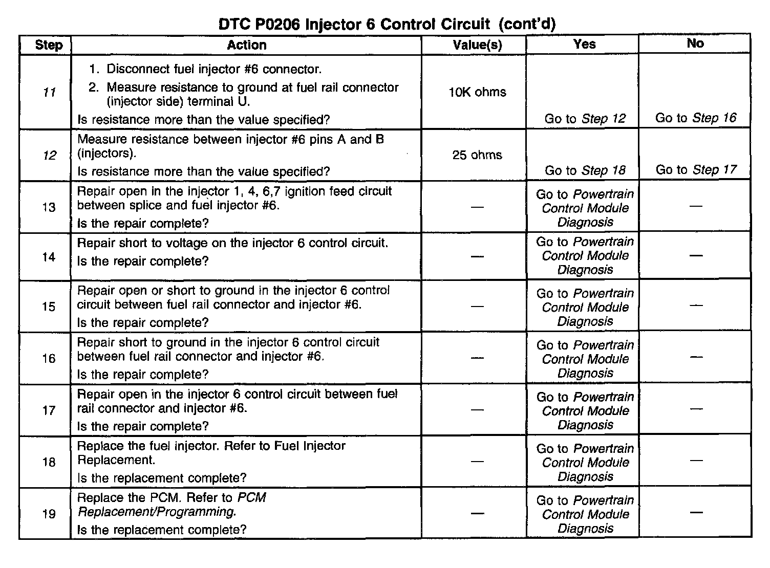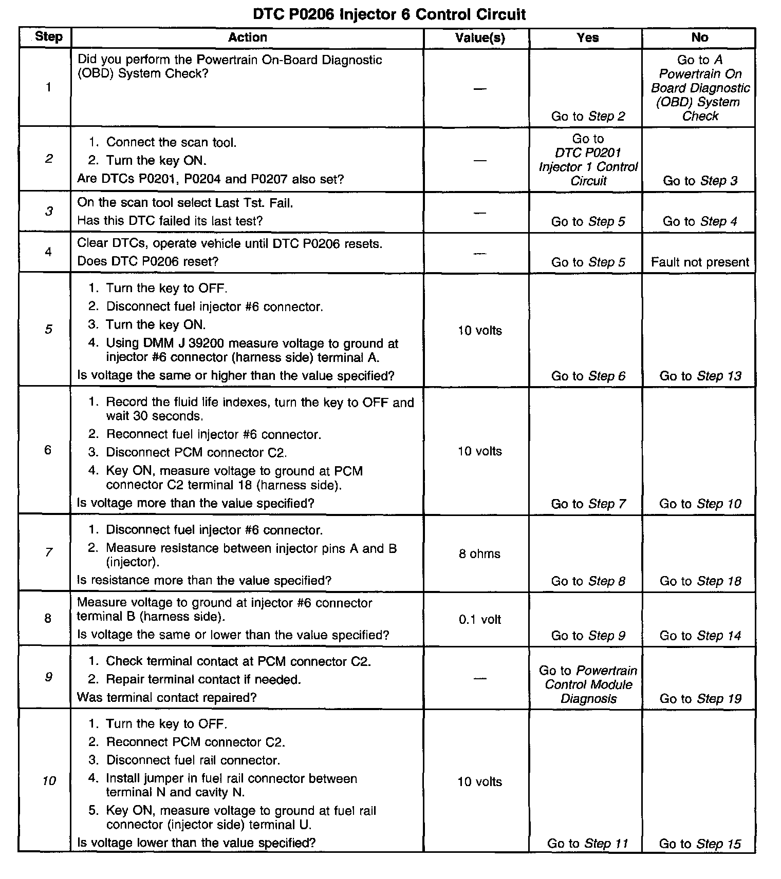 This PCM contains a General Field Effect Transistor (FET) Driver (GFD) that controls the eight fuel injector drivers. The GFD contains circuitry that is used to determine if there is a problem with any of the fuel injector circuits. The GFD has a fault line for each injector. The fault line goes high when an open, short to ground, or short to voltage is noticed in an injector circuit. DTC P0206 is set when the fault line for injector # 6 is high.