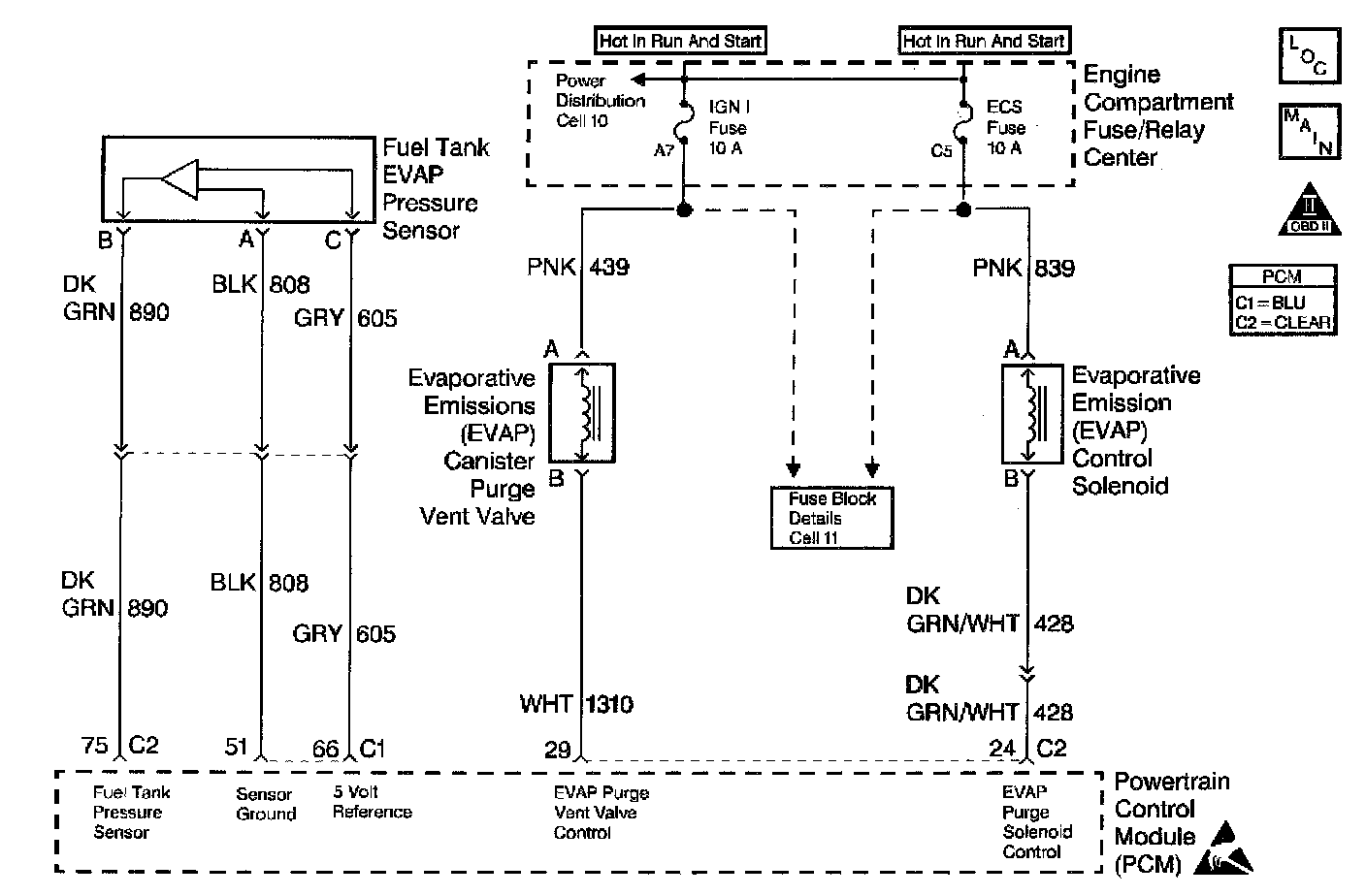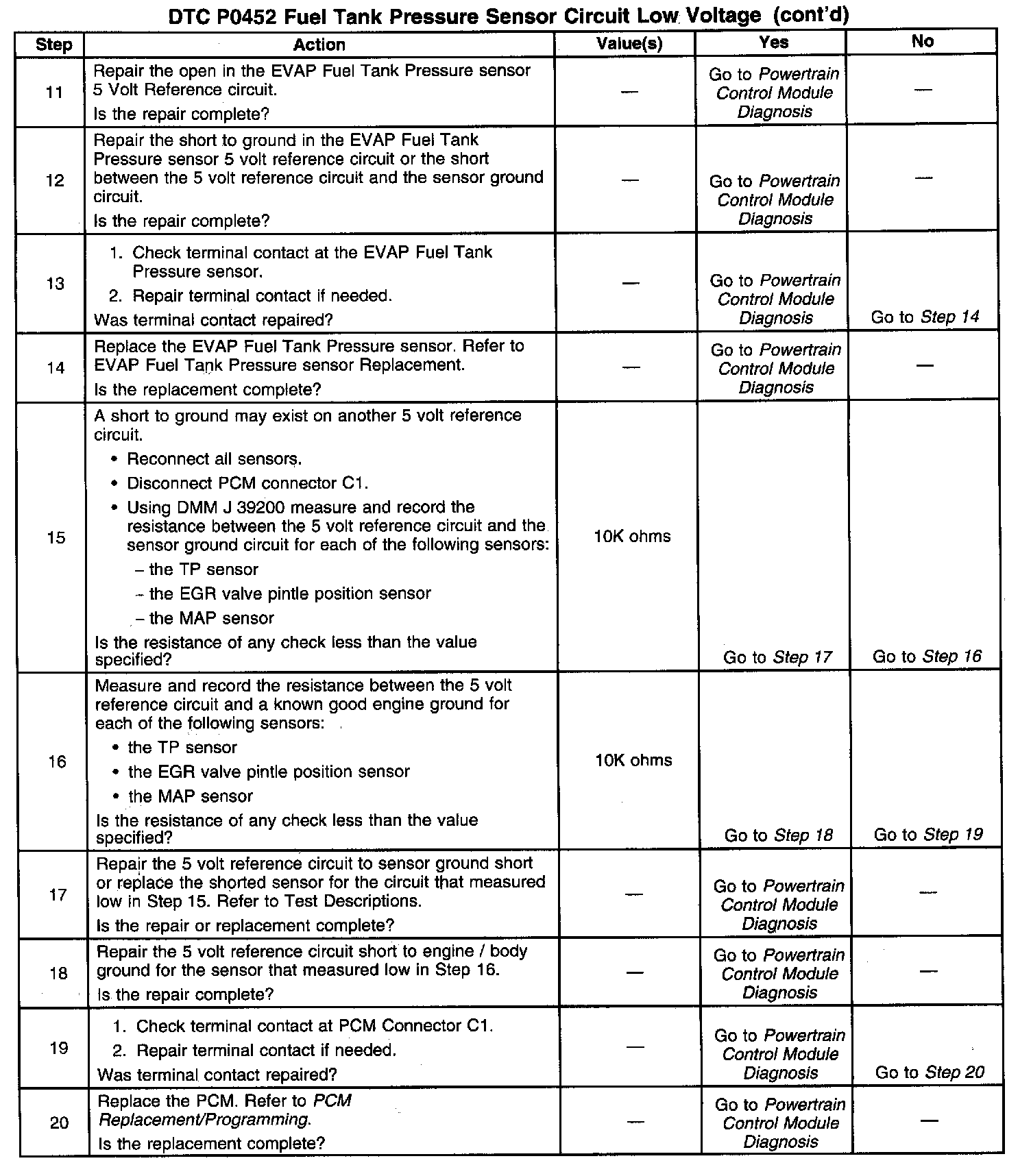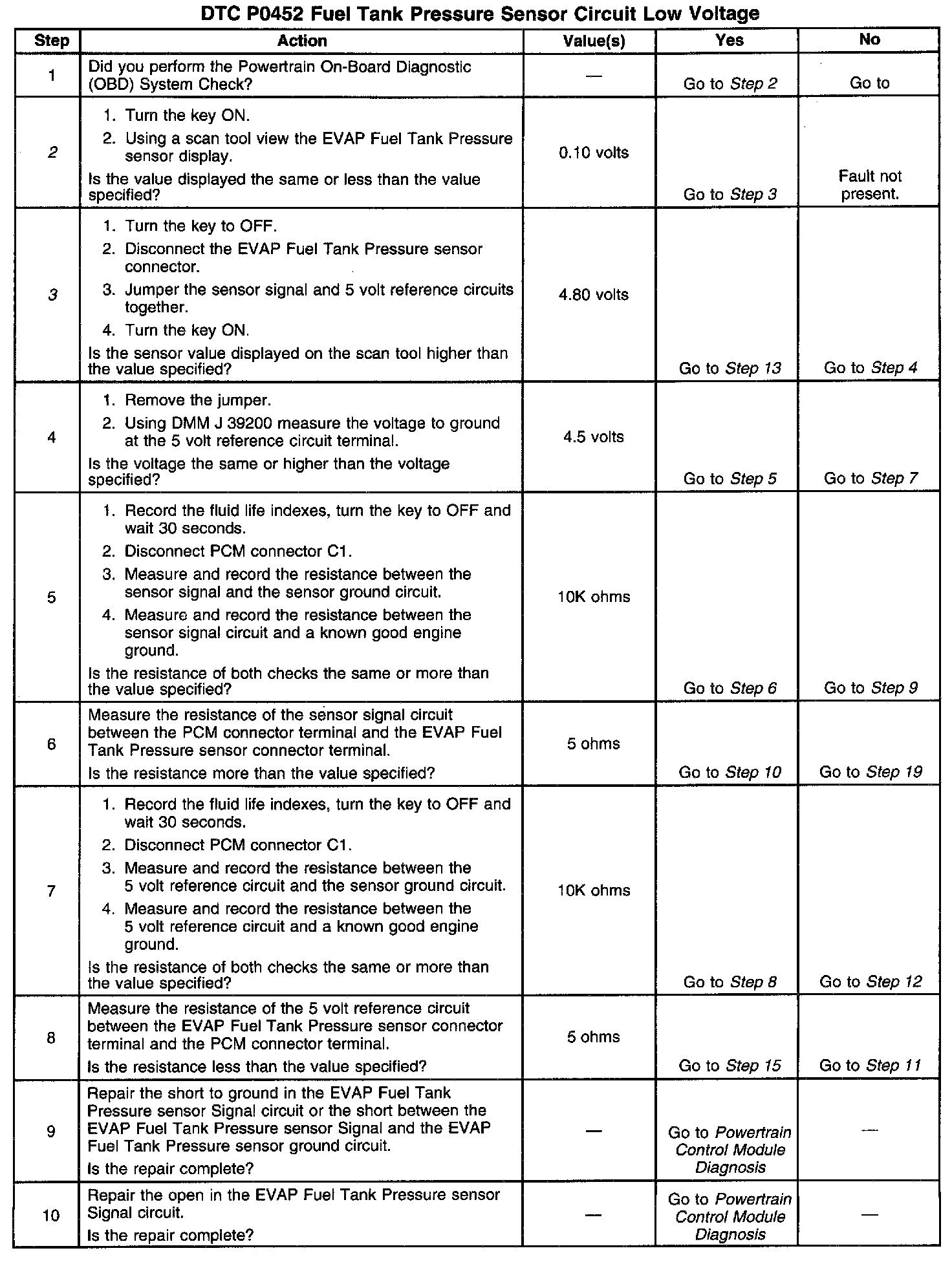 The PCM provides a 5 volt reference and ground. The EVAP Fuel Tank Pressure sensor signal varies between ground and 5 volts as fuel tank pressure varies. As pressure decreases (negative pressure, or vacuum), voltage increases. As pressure increases, voltage decreases (positive pressure, low voltage). The PCM uses the EVAP Fuel Tank Pressure sensor values as an indicator of EVAP system efficiency. If the EVAP Fuel Tank Pressure sensor signal goes low such as when the signal line is shorted to ground or the EVAP Fuel Tank Pressure sensor is shorted internally, this DTC will set.