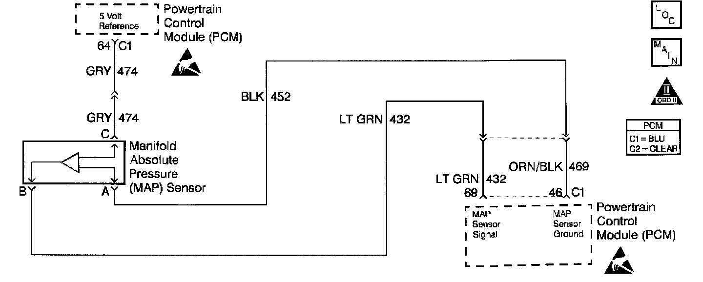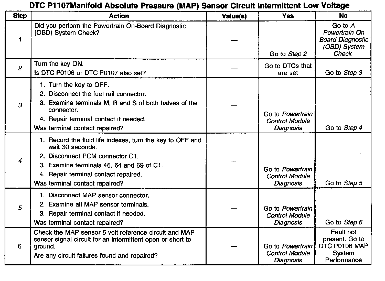 The Manifold Absolute Pressure (MAP) sensor is a sensor that changes resistance based upon manifold vacuum. The PCM provides a 5 volt reference and ground. The MAP sensor signal varies between ground and 5 volts as manifold vacuum varies. As MAP decreases, voltage decreases (low engine load, high vacuum). As MAP increases, voltage increases (high engine load, low vacuum). The PCM uses the MAP sensor values as an indicator of engine load. DTC P1107 sets when the PCM detects a MAP sensor signal that is too low.