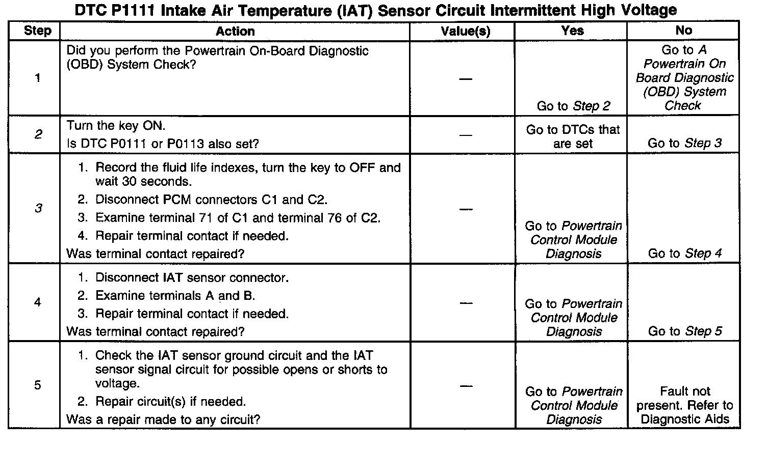 2. If DTC P0111 is also set, diagnose it first because it may help to pinpoint a faulty IAT sensor.