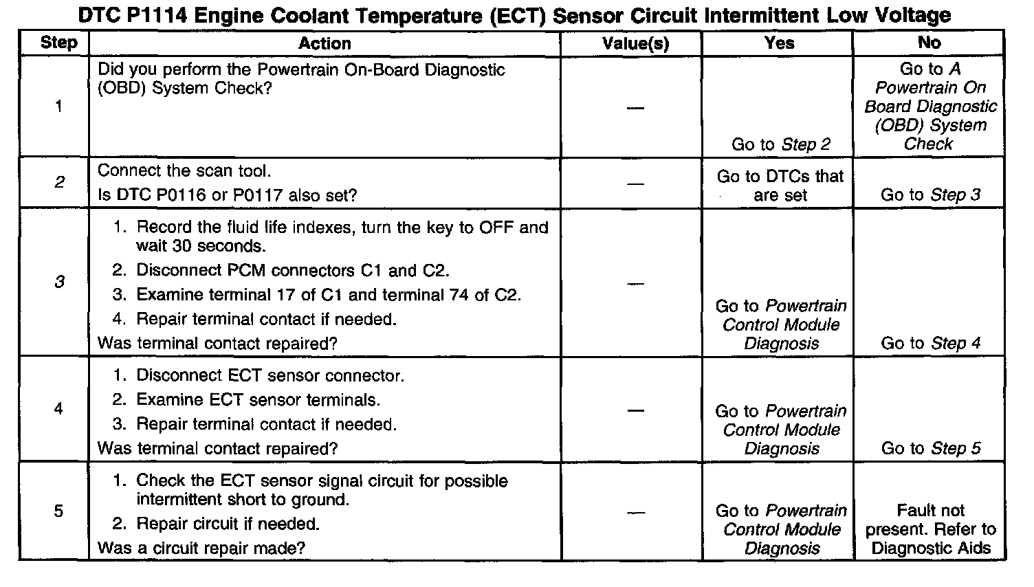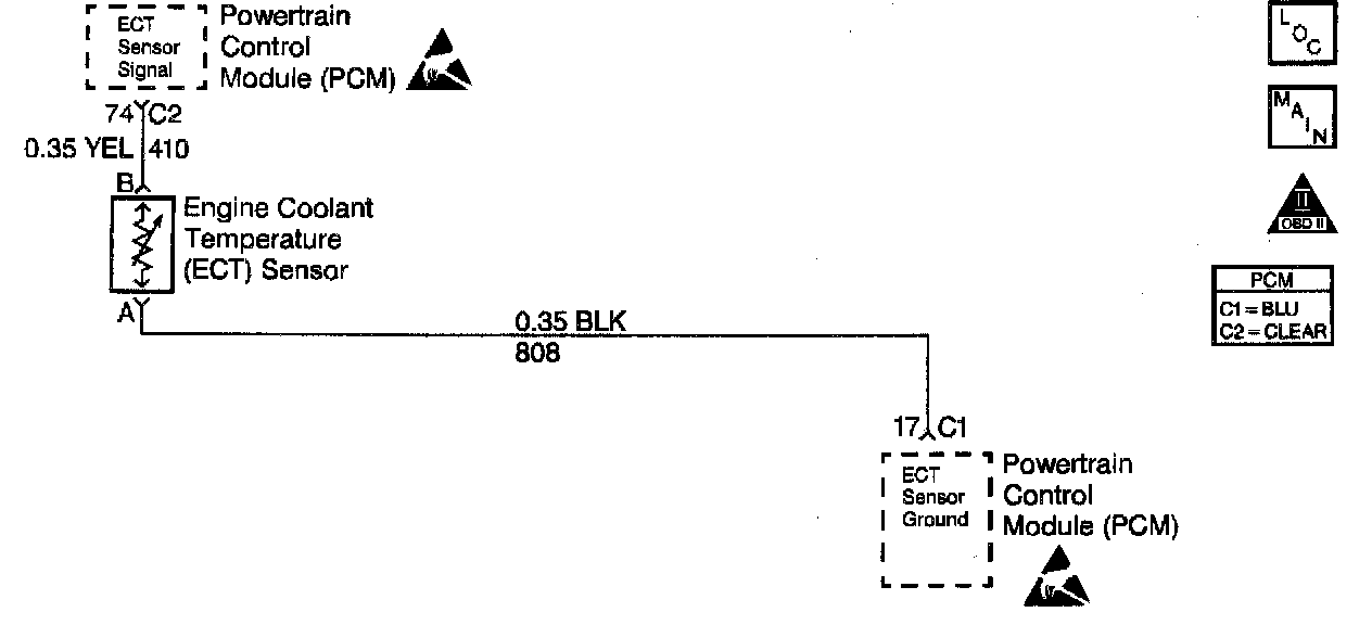 The Engine Coolant Temperature (ECT) sensor is a thermistor, a sensor whose resistance varies with temperature. The ECT sensor signal is on CKT 410 and sensor ground on CKT 808. As the temperature increases, sensor resistance decreases. High coolant temperature will result in low signal voltage on CKT 410. If the ECT reading is 151°C (304°F) or higher, the PCM sets DTC P1114.