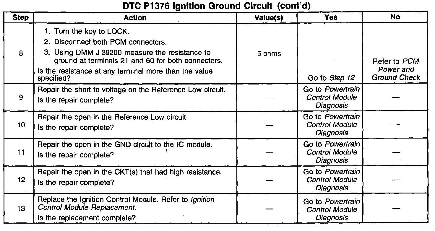 The PCM applies 2.5 volts on the Ref Lo voltage (CKT 453) circuit to the Ignition Control Module. Ref Lo voltage to the PCM represents the voltage difference between Ref Lo and the PCM power ground. This is needed to ensure that the PCM and Ignition Control (IC) module signals all have the same ground reference. If the Ref Lo input voltage goes too high or low, DTC P1376 will set.