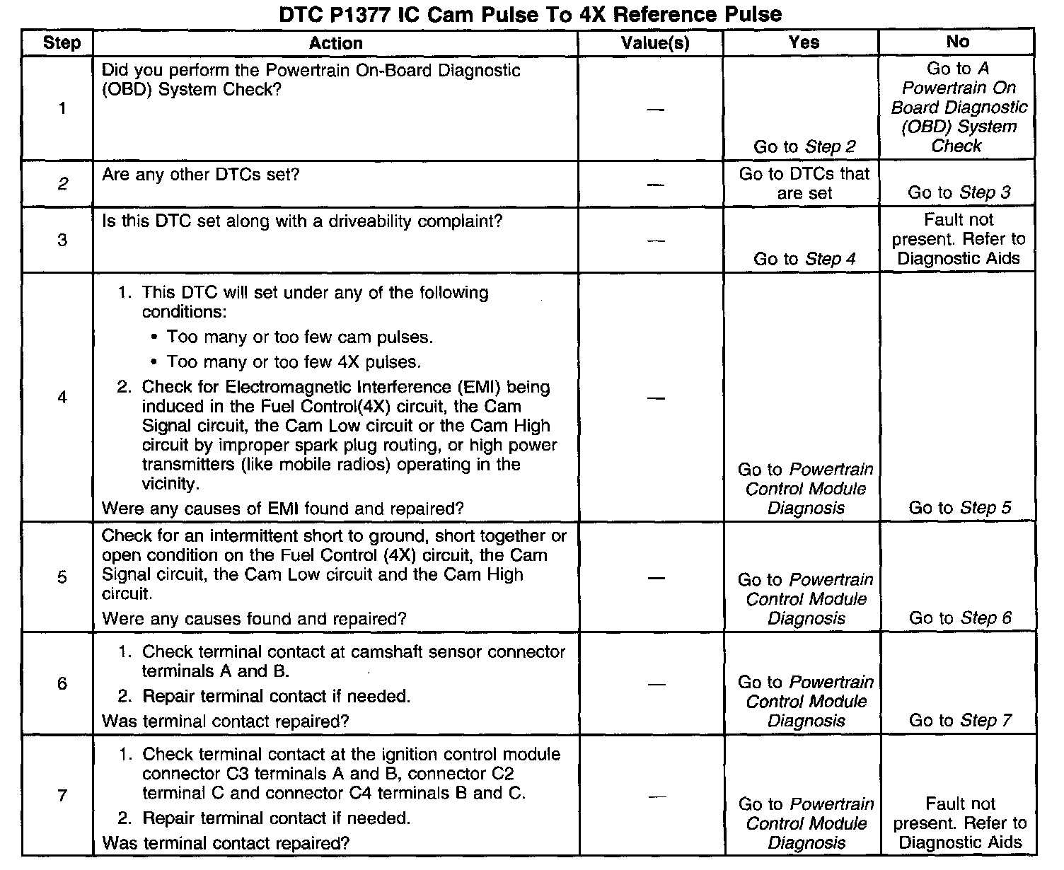 This DTC may also set if all four camshafts are off by one tooth, 10 degrees before top dead center, this will be accompanied by severe driveability complaints.