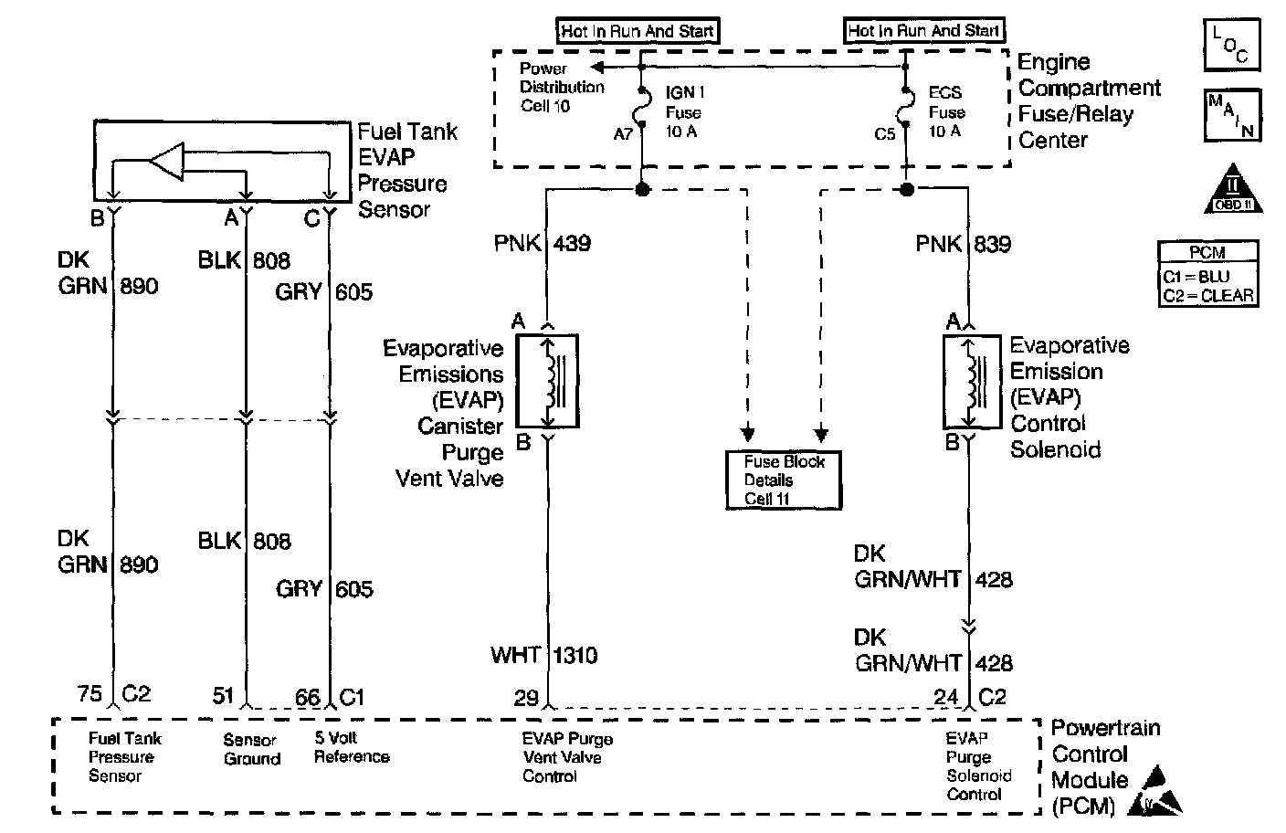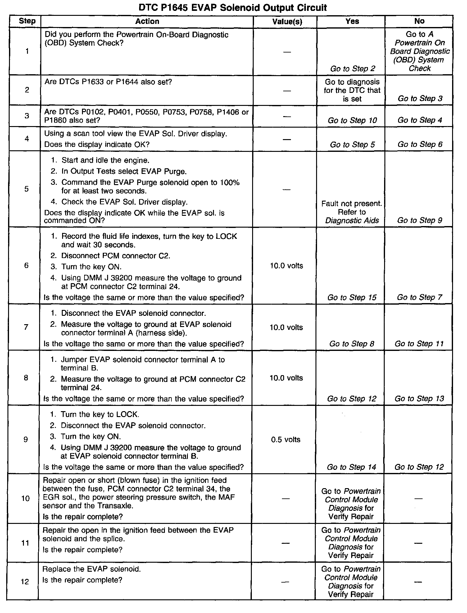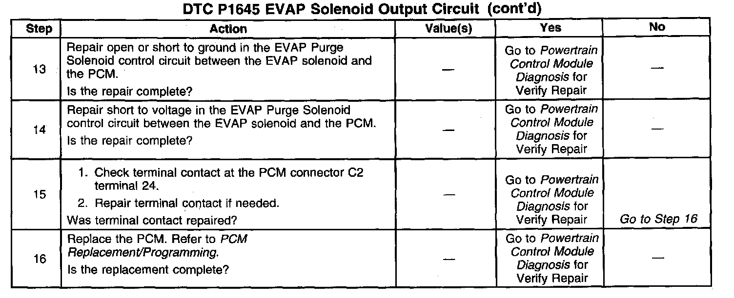 The PCM contains chips called Output Driver Modules that provide 7 switchable ground outputs for operating solenoids, relays, telltales, and other devices. Each of these ground outputs has an internal fault line that feeds back to the PCMs microprocessor. When the output is OFF, the output driver should receive the 12 volts fed to the solenoid, relay, etc. When the output is ON, it should receive 0 volt since it is grounding the output. If it receives 0 volt when the output is OFF or 12 volts when the output is ON, it sets the fault line low. DTC P1645 is used to monitor the fault line of the EVAP purge solenoid.