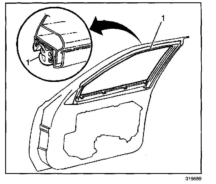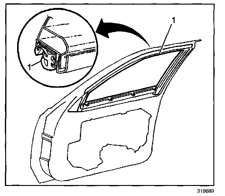3. Use a thin-bladed tool in order to position the remainder of the run channel (1) into the door frame.