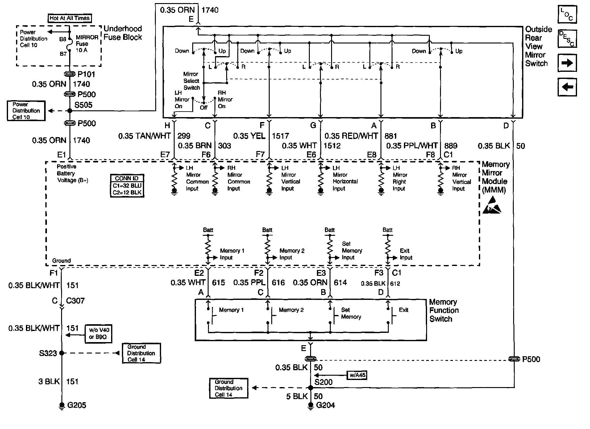 Outside Mirror Schematics: Power Mirror Switch, DeVille With Memory Mirrors: