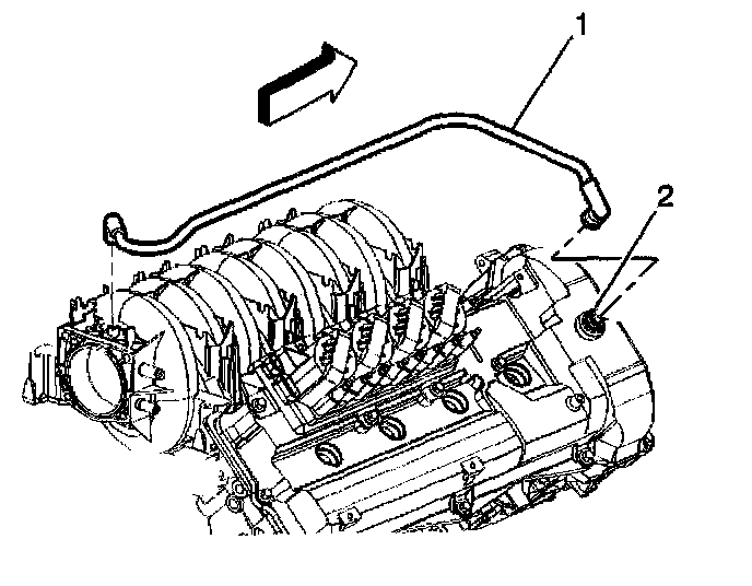 4. Disconnect the PCV dirty air tube (1) from the PCV valve (2) and the intake manifold.