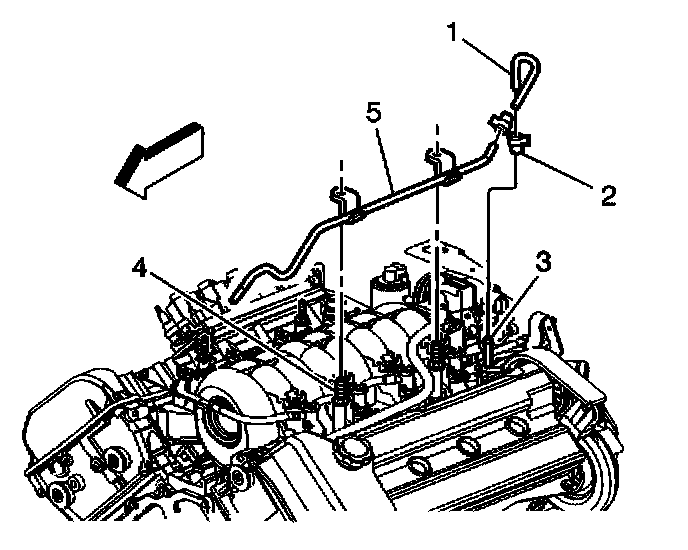 12. Disconnect the throttle body heater outlet hose (1) from the throttle body (3) and remove the coolant overflow pipe (5) from the intake manifold studs (4).