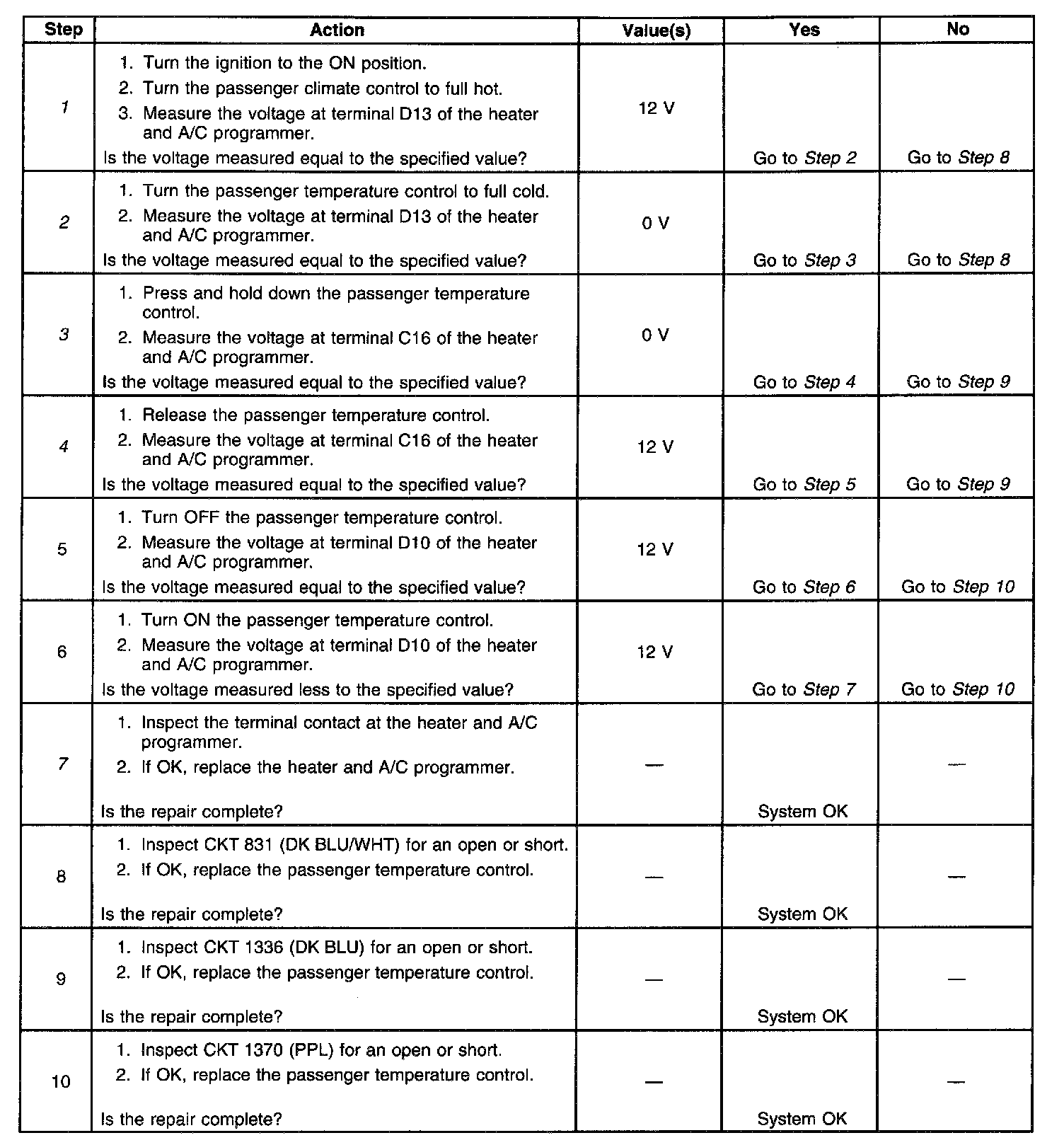 1. Checks the temperature control (full hot) of the Passenger Climate Control. Also verifies the condition of CKT 831.