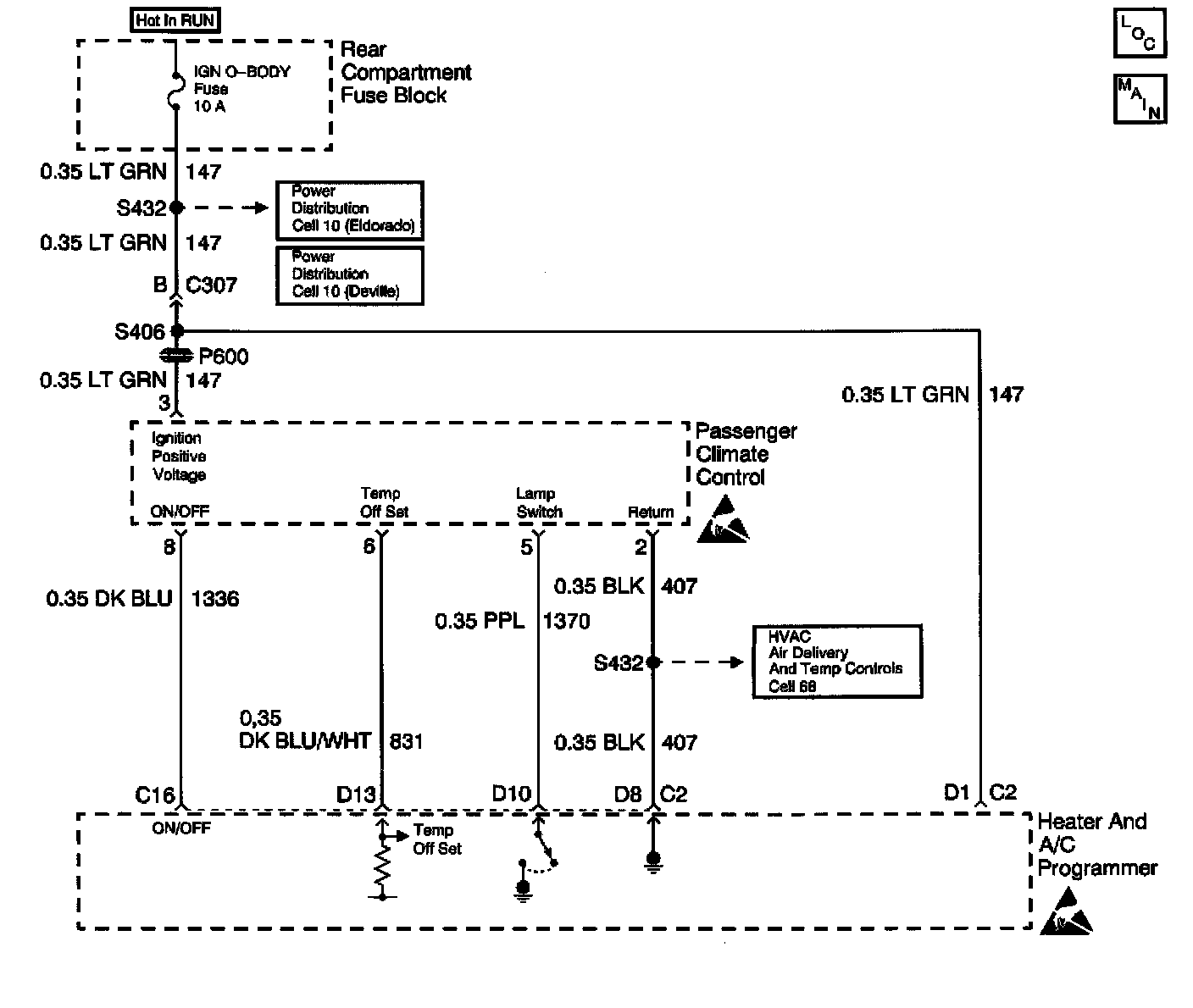 The heater and A/C programmer receives the requested temperature offset on CKT 831 (DK BLU/WHT) from the passenger climate control. The heater and A/C programmer controls the on and off status of the passenger climate control on CKT 1336 (DK BLU).