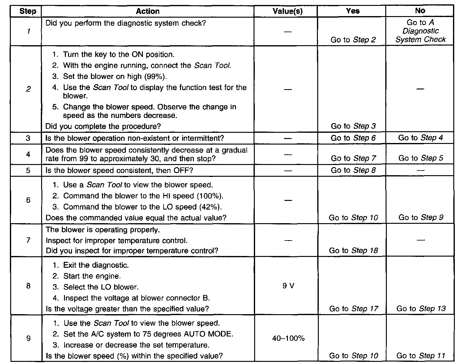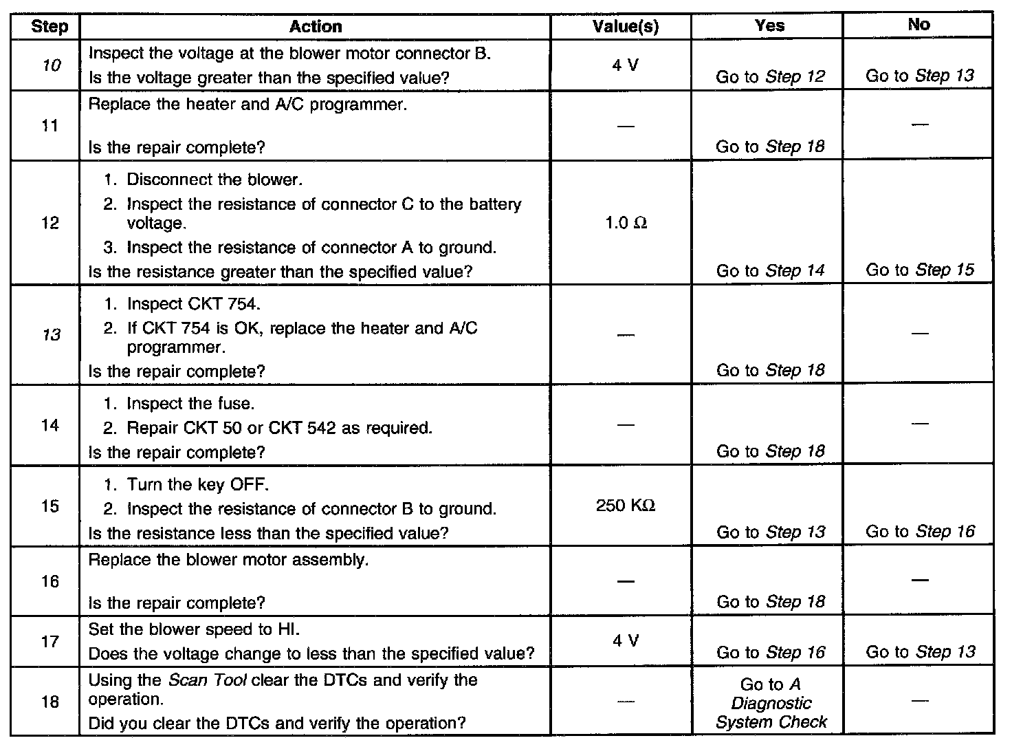 10. The Scan Tool displays the blower speed input voltage from the Heater and A/C Programmer to the Blower Motor Assembly. Checking for the cause in CKT 754 or the Heater and A/C Programmer output.