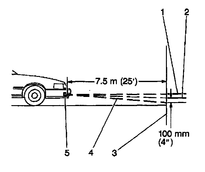 5. Adjust the fog lamp (5) 50 that the top edge of the fog lamp beam pattern (2) is 100 mm (4 in) below the horizontal centerline (1).
