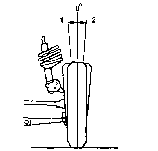 The camber is the amount the wheels tilt from vertical when viewed from the front or rear of the car. The camber is positive (+) if the wheels tilt outward at the top (2). The camber is negative (-) if the wheels tilt inward at the top (1). The amount of tilt is measured in degrees from the vertical.