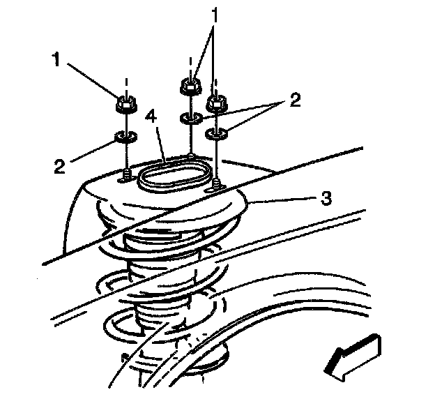 1. Support the car by the wheels. Remove the three top strut mounting nuts (1) and washers (2).