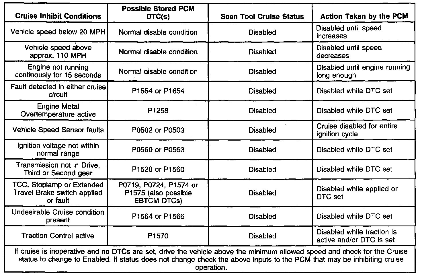 This powertrain has a stepper motor cruise control (SMCC) system which closely approximates a stand alone system, except that the SMCC relies on the PCM to indicate that cruise control is allowed and then signals the PCM when engaged. This is accomplished by using a two wire link between the PCM and SMCC. These are called the Cruise Inhibit and the Cruise Engaged circuits. If the PCM will allow operation, refer to the Cruise Operation table, it signals the SMCC on the Cruise Inhibit circuit to allow cruise. Once cruise is engaged by the driver, the SMCC will continuously signal to the PCM that cruise is engaged using the Cruise Engaged circuit.