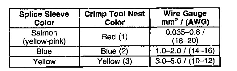 4. Select the proper sealed splice sleeve according to the wire size. Refer to the above table at the beginning of the repair procedure for the color coding of the splice sleeves and the crimp tool nests.