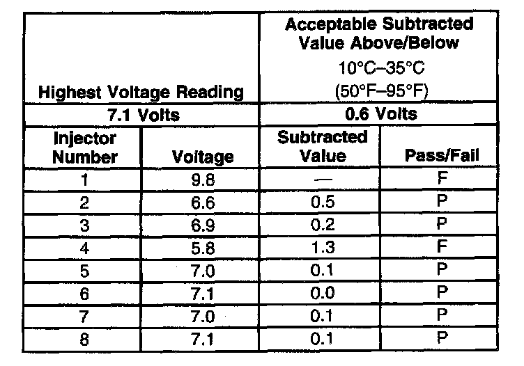3. The first second of the voltage displayed by the DMM may be inaccurate due to the initial current surge, therefore, record the lowest voltage displayed by the DMM after the first second of the test. The voltage displayed by the DMM may increase throughout the test as the fuel injector windings warm and the resistance of the fuel injector windings changes. An erratic voltage reading (large fluctuations in voltage that do not stabilize) indicates an intermittent connection within the fuel injector. From the voltages recorded, identify the highest voltage, excluding any voltages above 9.5 volts. Subtract each voltage that is not above 9.5 volts from the highest voltage. Record each subtracted value. The subtracted value for any fuel injector must not exceed 0.6 volt. A fuel injector with a subtracted value that is greater than 0.7 volt is considered faulty and must be replaced. A fuel injector with a recorded voltage above 9.5 volts is also considered faulty and must be replaced.
