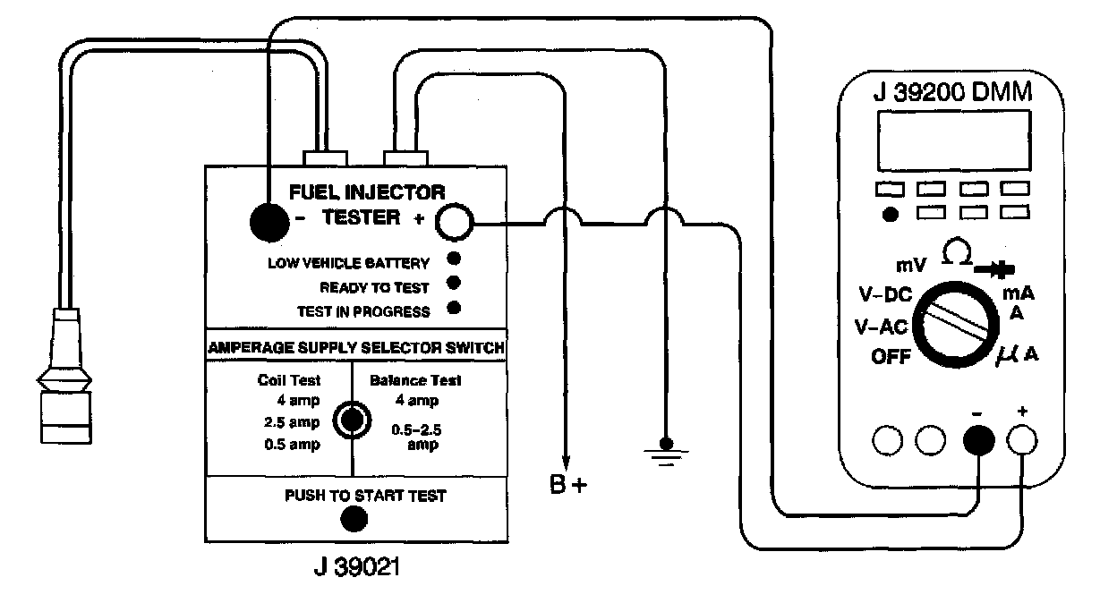 The injector coil test is performed to diagnose a faulty fuel injector. The injector coil test makes use of the Fuel Injector Test J 39021. The tester is used to supply current to each fuel injector. This allows injector resistance measurement by using a Digital Multi-Meter (DMM) to measure voltage drop.