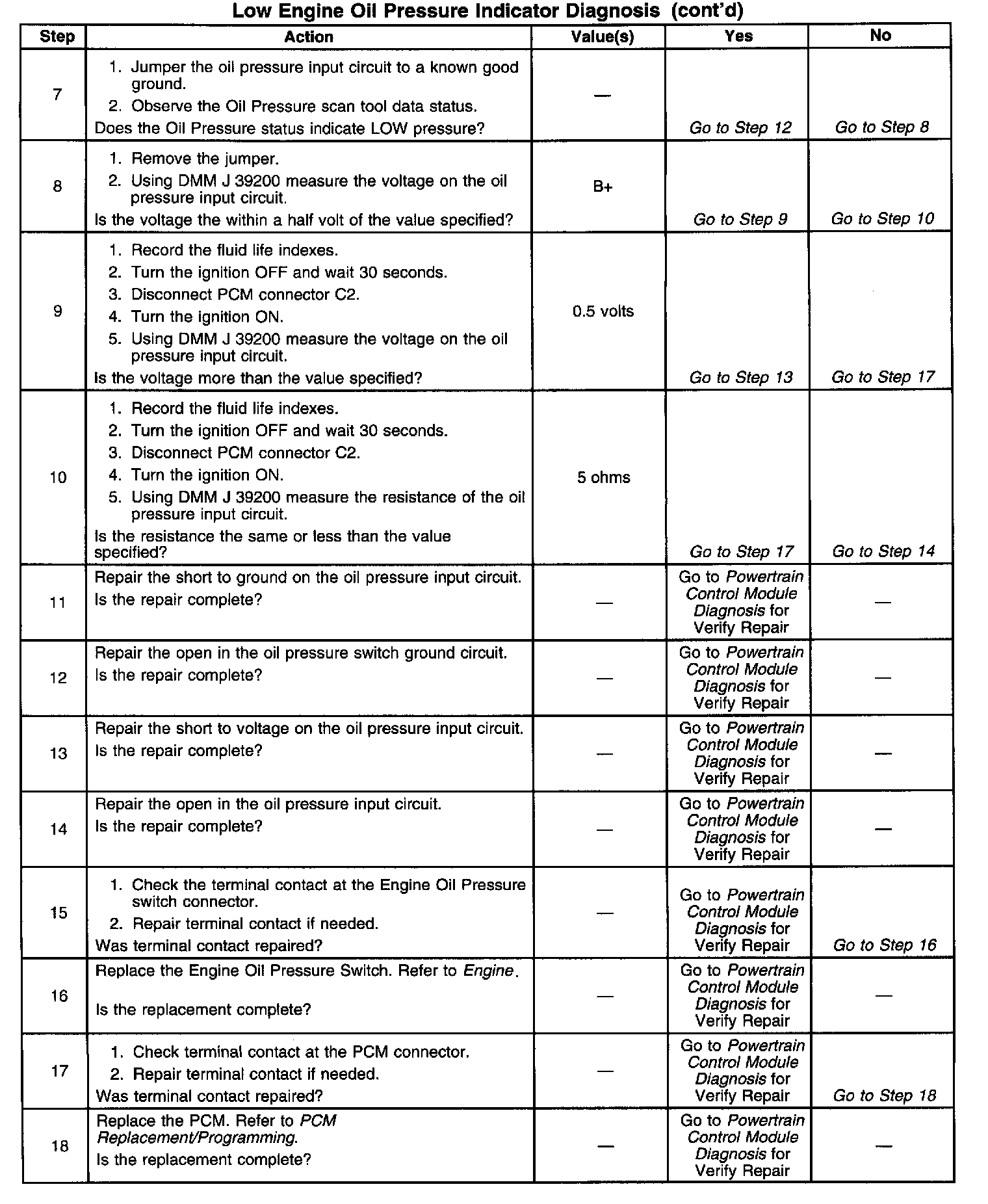 When the PCM monitors a low oil pressure condition the PCM will command a message be displayed on the Driver Information Center (DIC) or Instrument Panel Cluster (IPC) depending upon vehicle model. The PCM will also increase the Desired Idle engine speed in an attempt to raise engine oil pressure.