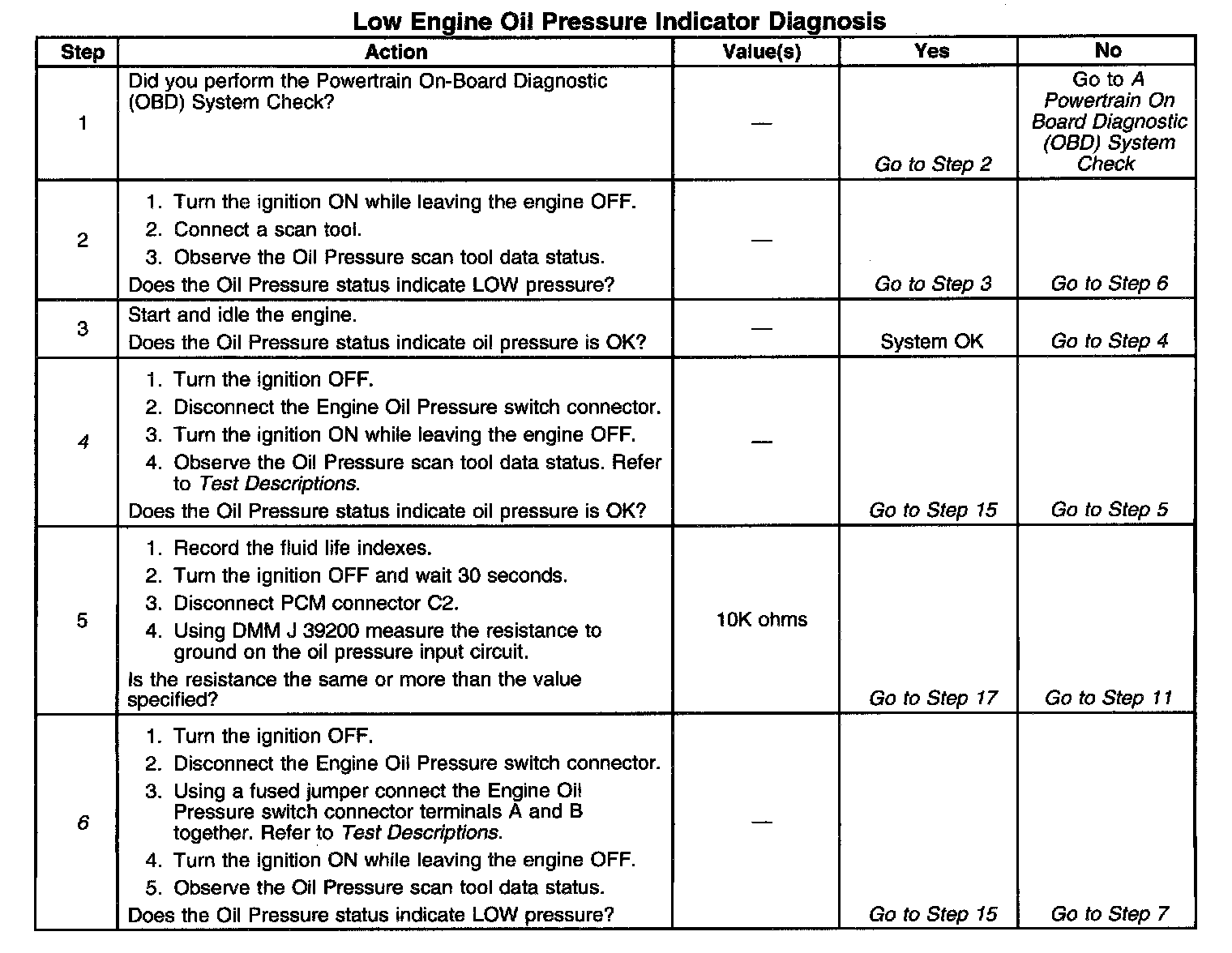 The engine oil pressure switch is normally closed. When engine oil pressure increases above 1 to 4.5 psi the switch contacts open. The PCM supplies 12 volts to the oil pressure input circuit. With low oil pressure the 12 volts is pulled low to ground.