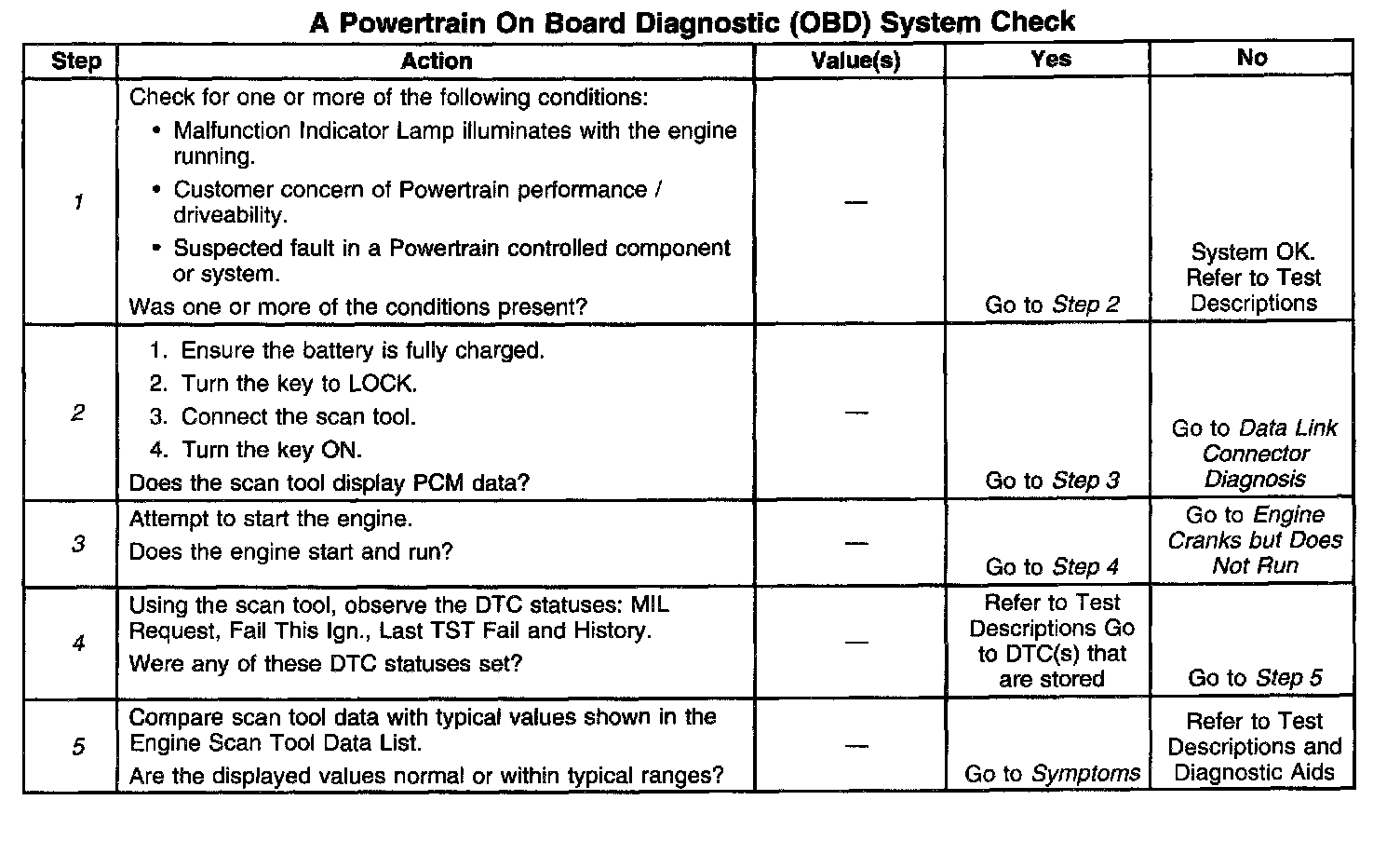 POWERTRAIN ON BOARD DIAGNOSTIC (OBD) SYSTEM CHECKThe Diagnostic System Check is an organized approach to identifying a problem created by an electronic engine control system malfunction. The Diagnostic System Check must be the starting point for any driveability complaint diagnosis, because it directs the service technician to the next logical step in diagnosing the complaint. Understanding the table and using it correctly will reduce diagnostic time and prevent the replacement of good parts.