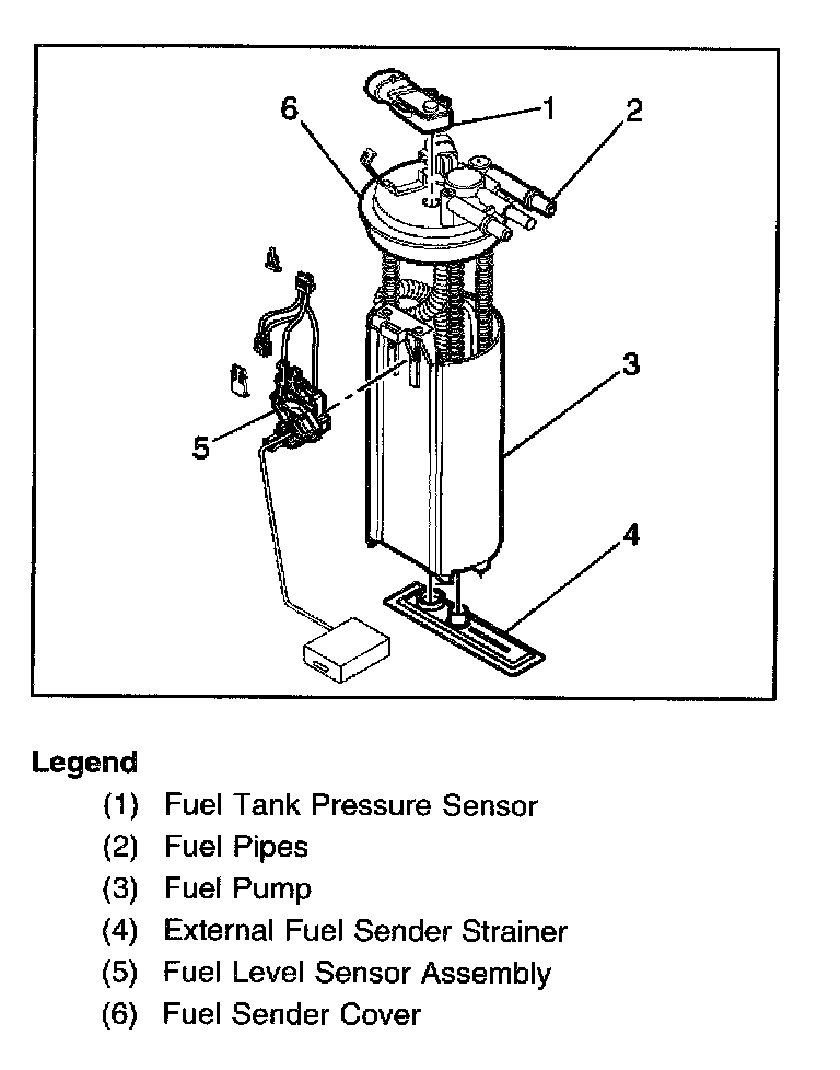 The modular fuel sender assembly consists of the following major components: A fuel sender cover assembly, a fuel sender, fuel pipes (above cover), a fuel sender support assembly, a fuel pump, a fuel pump strainer, a fuel pump reservoir, a fuel sender strainer, and a fuel level sensor assembly.
