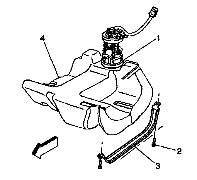 8. Remove the modular fuel sender assembly (1) from the fuel tank (4) using J 39765 Fuel Sender Locknut Wrench.