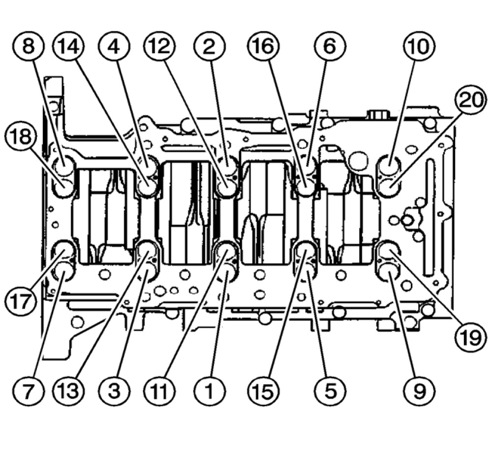 Tighten the lower crankcase bearing bolts (numbers 1 through 20) to 20 Nm (15 lb ft) in the proper sequence.