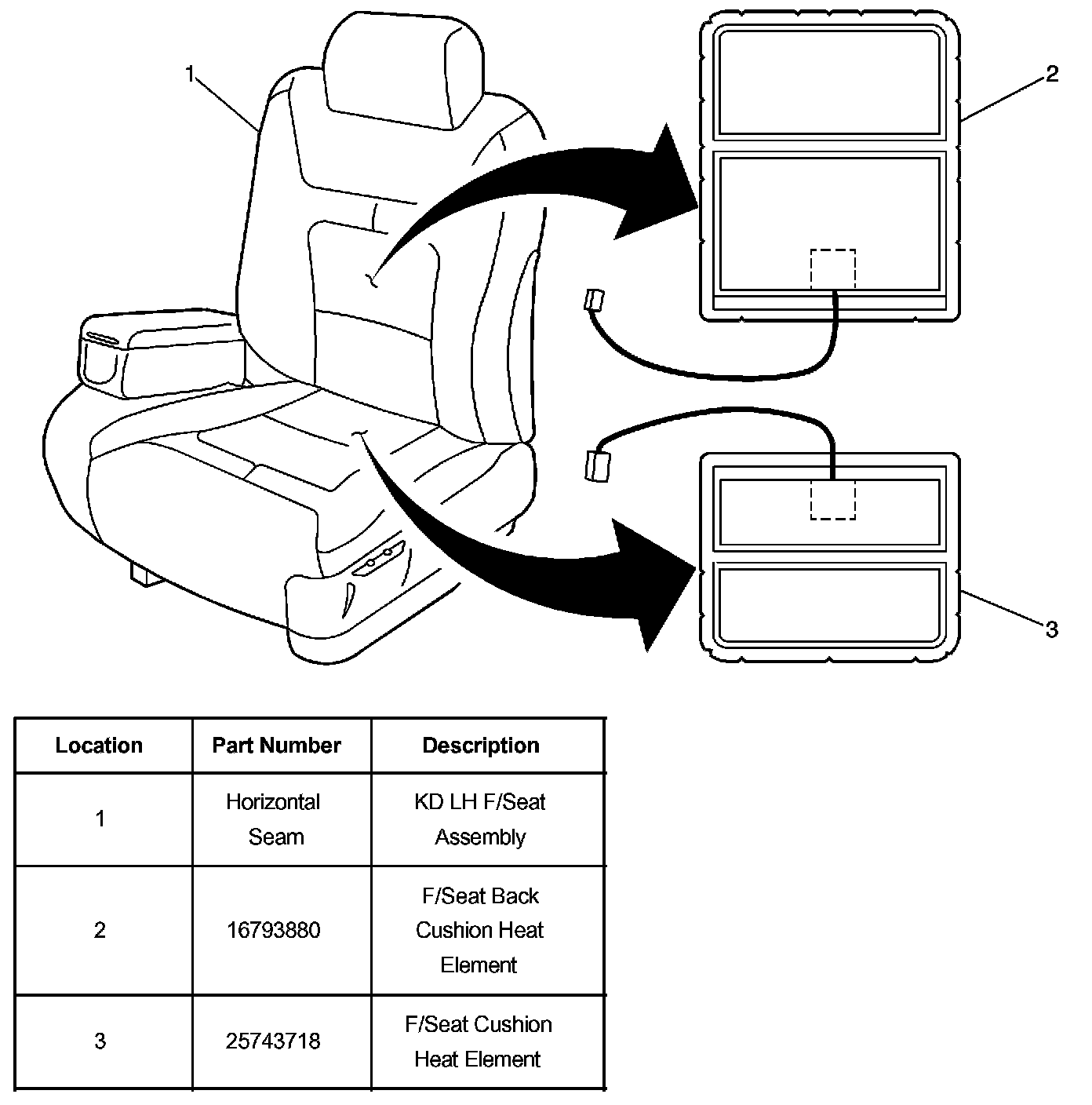 The heated seat system in the base model DeVille (KD) consists of two front heated seats. Each heated seat has two heat elements, one in the seat back and one in the seat cushion.