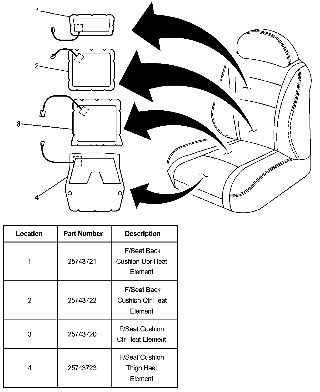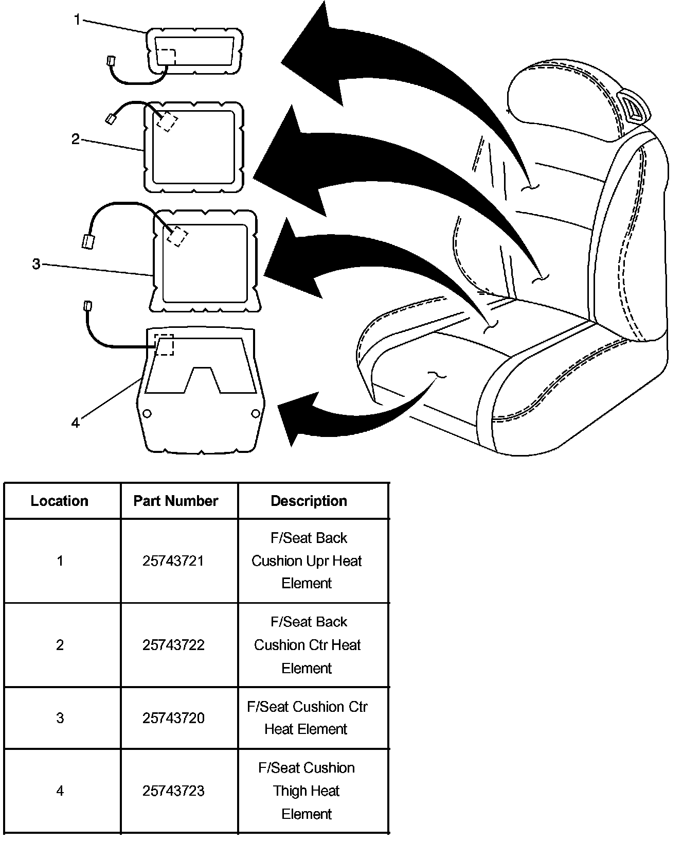 The heated seat system consists of two front heated seats. Each heated seat has four heat elements, two in the seat back and two in the seat cushion.
