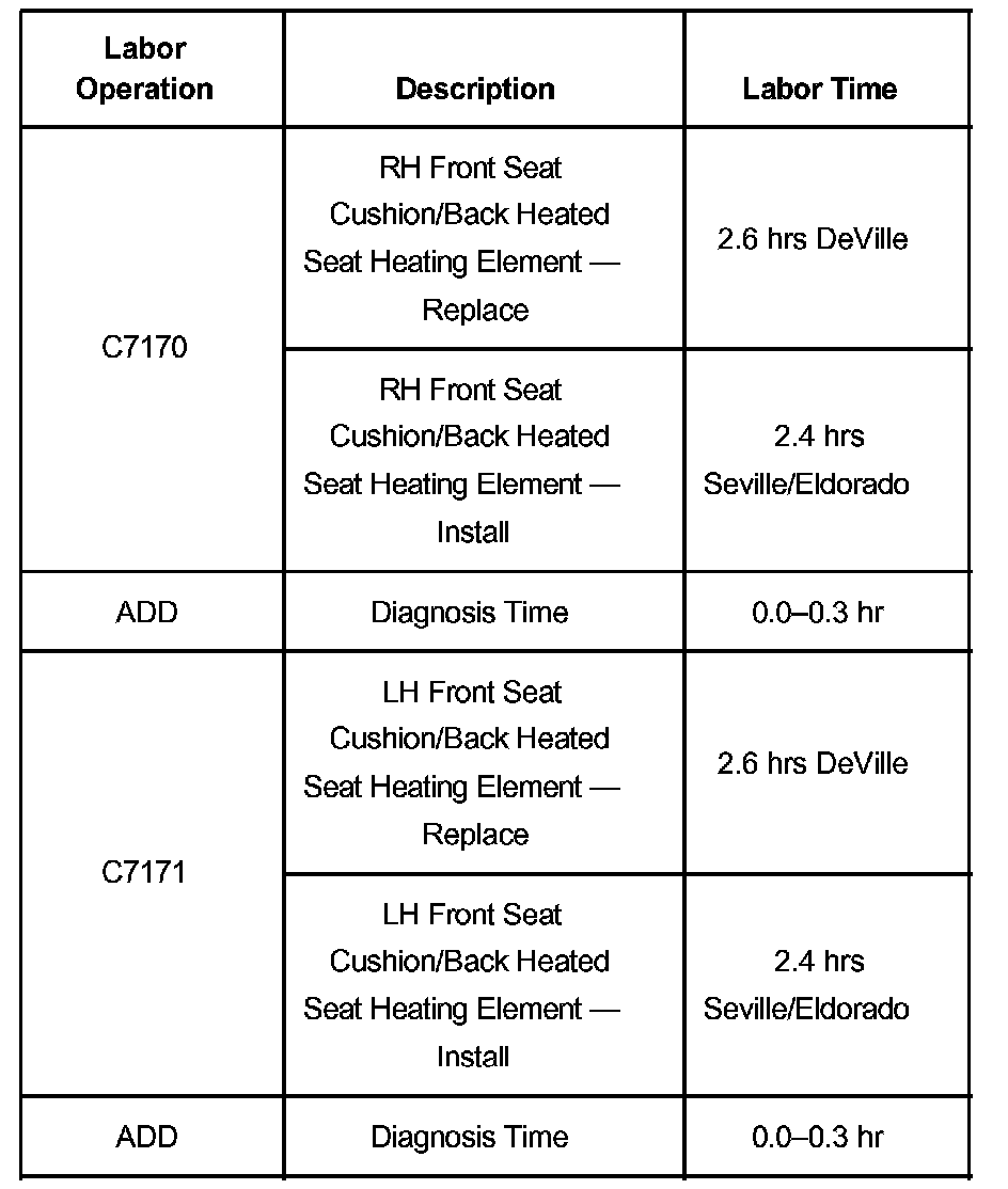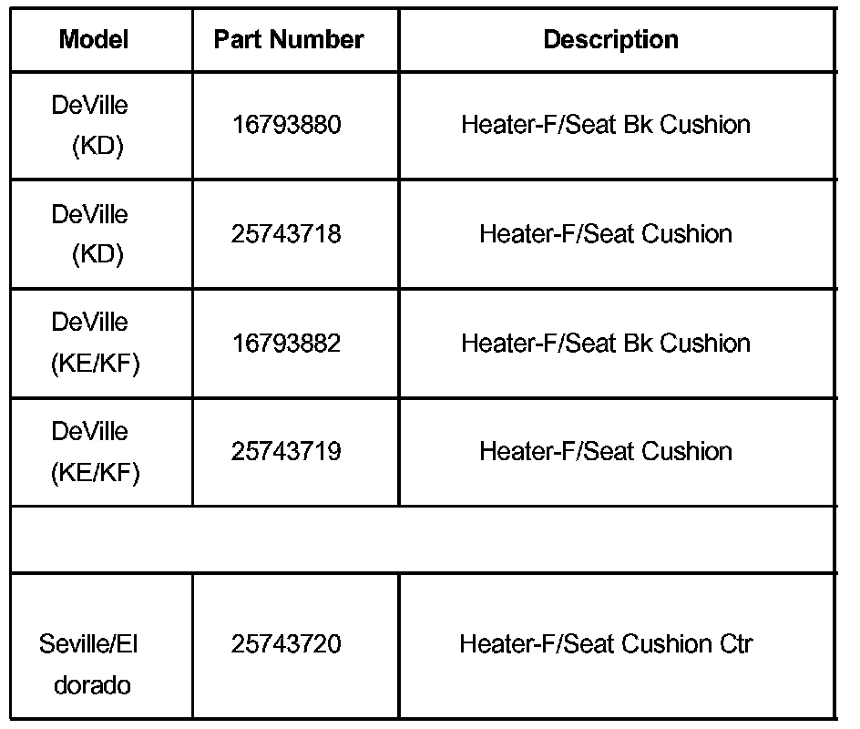 The heated seat system in the DeVille D'Elegance (KE, RP0-YP7) and Concours (KF, RP0-YP8) models consist of two front heated seats. Each heated seat has two heat elements, one in the seat back and one in the seat cushion.